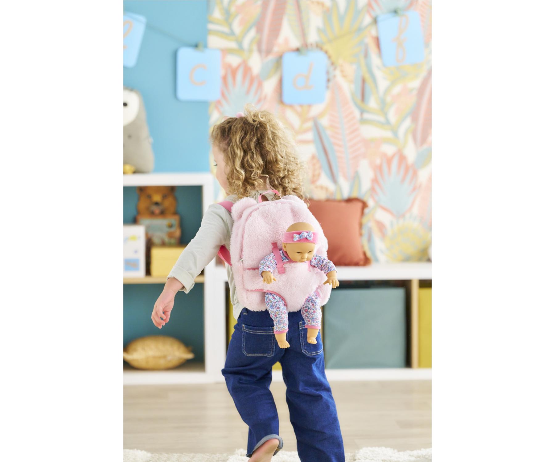 Fluffy backpack with doll carrier. Encourages imaginative play, nurturing skills, adventure Fits dolls up to 12 inches. Features large zip-shut storage space, adjustable storage straps. Designed with fluffy plush fabric, bright pink trim Includes one carrier backpack. Doll not included - Sold separately. Backpack measures 10.25 x 9 x 3.15 inches