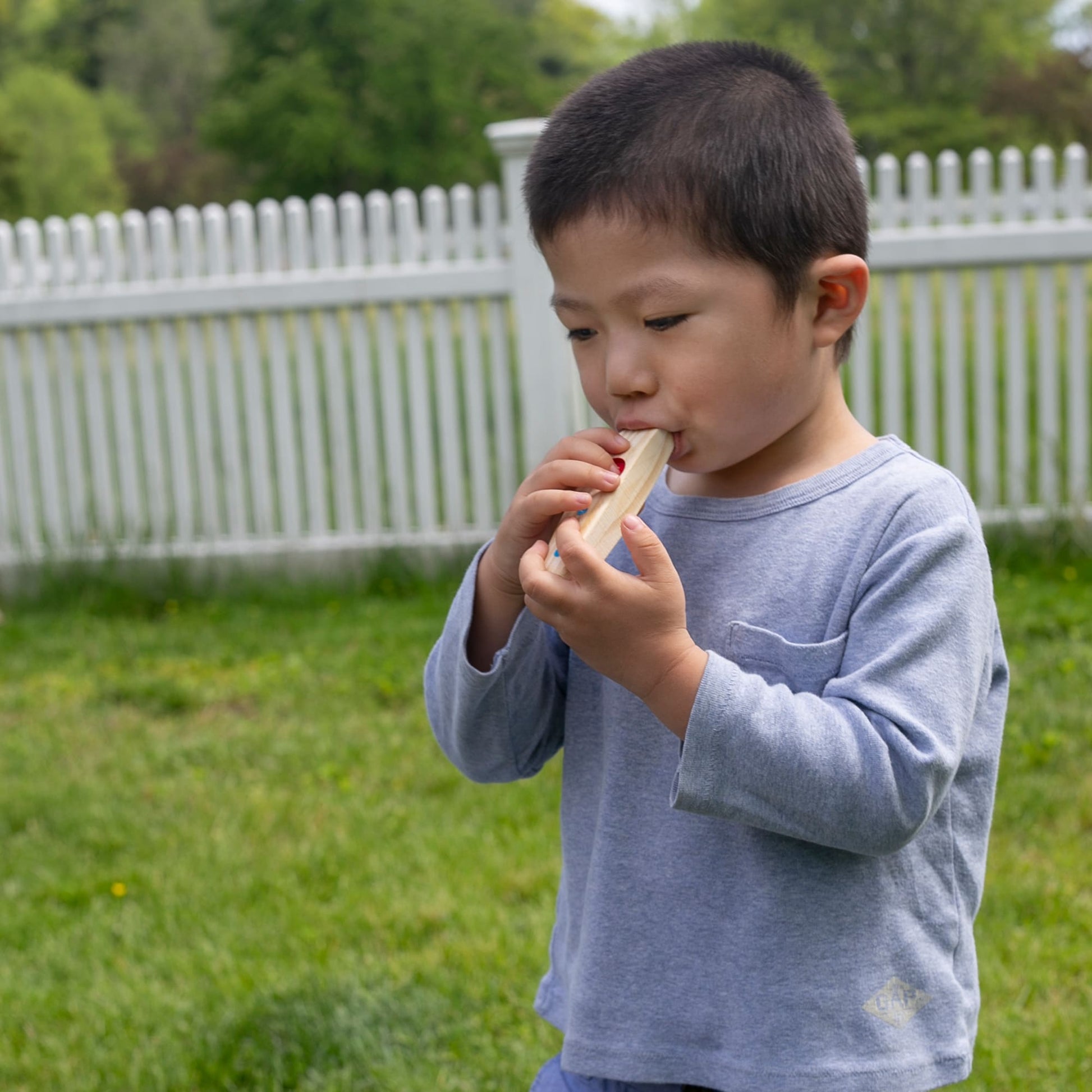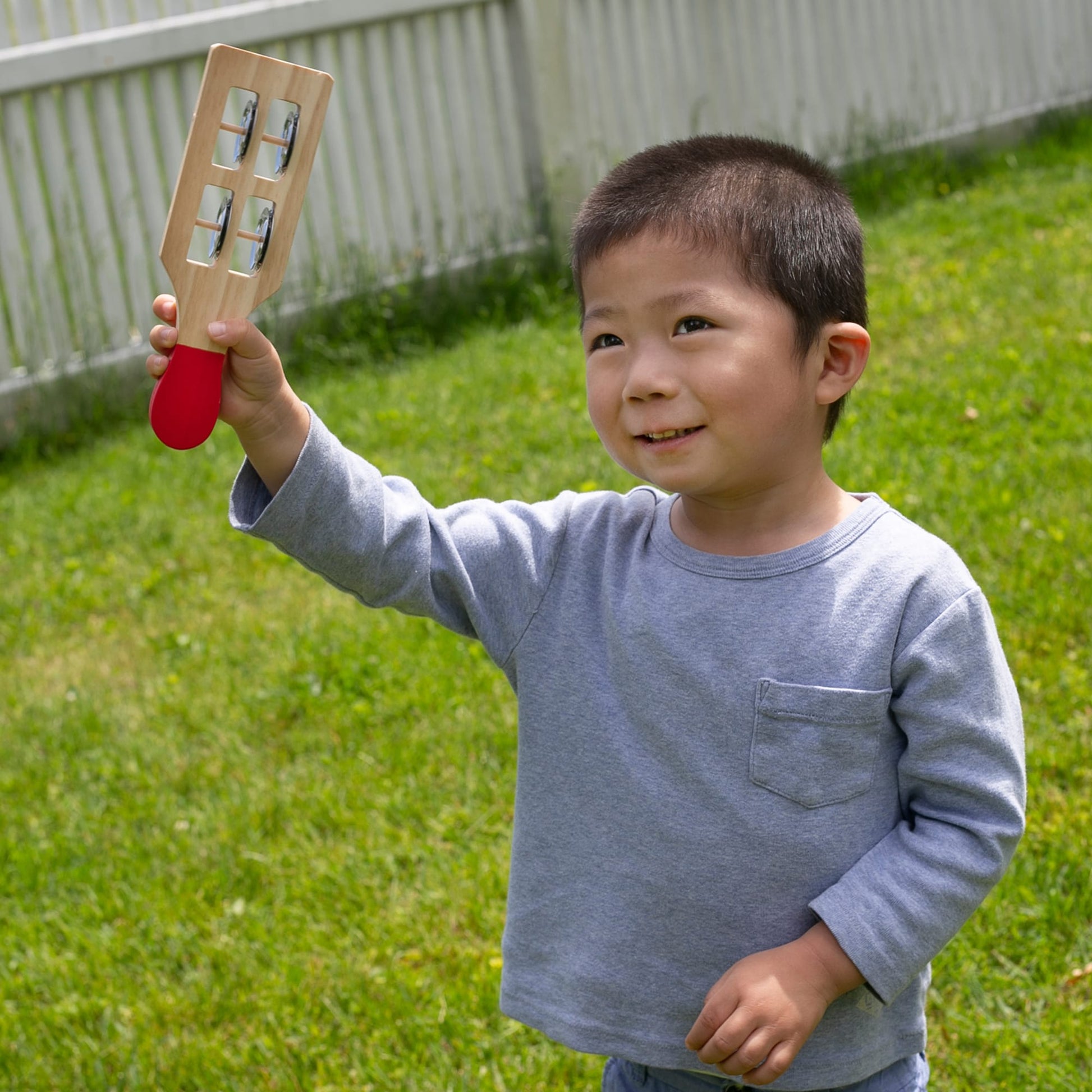 - Includes a kazoo, a harmonica, a xylophone, a jingle stick and castanets