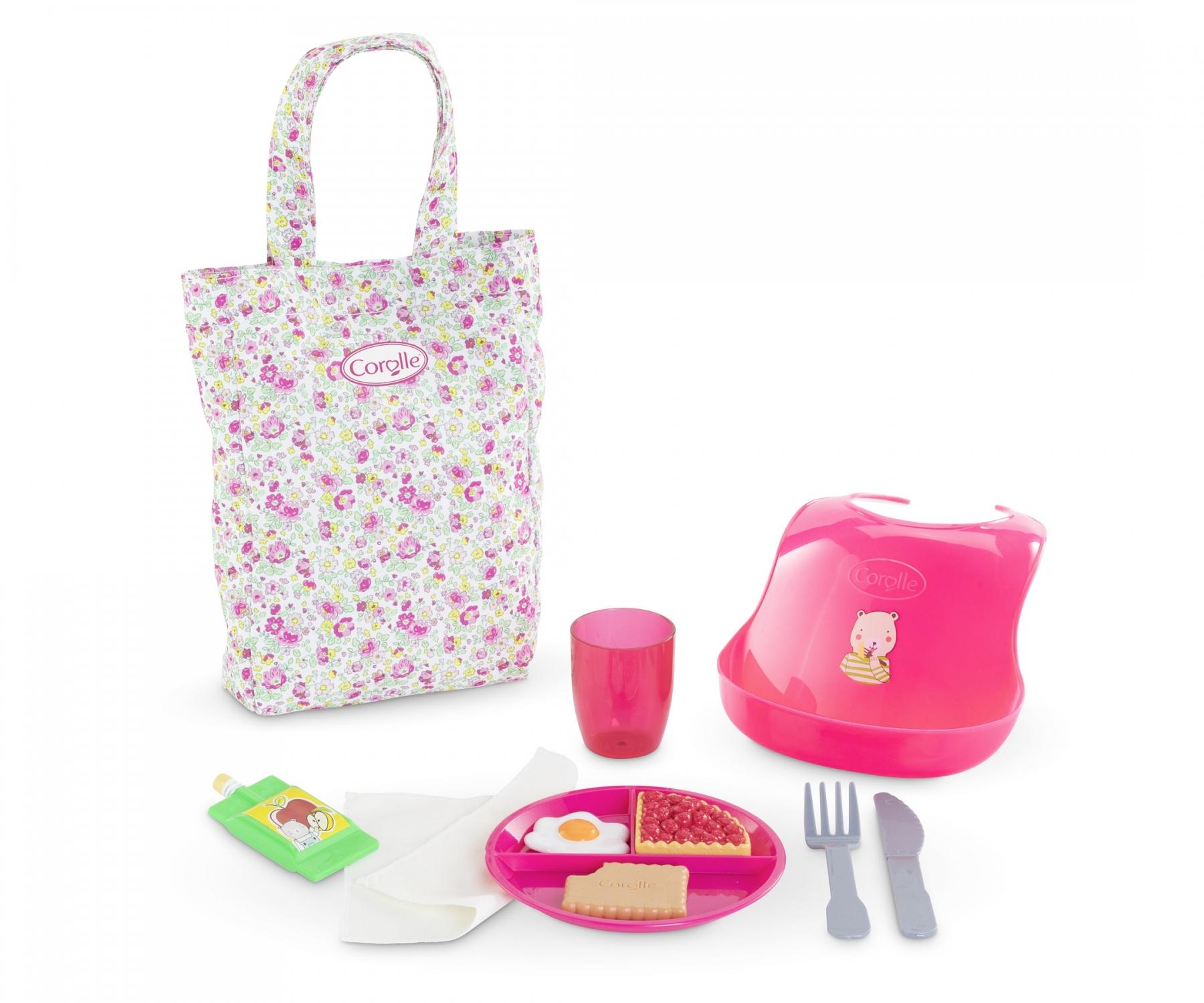 Time to eat! The Large Mealtime Set includes everything needed -- accessories and pretend food -- for a favorite large Corolle baby doll at mealtime: divided feeding dish, fork, knife, drinking glass, food-catcher bib and cloth napkin plus these pretend foods: a fried egg, a slice of strawberry tart, a cookie and an apple compote. The tote bag, also included, helps to keep everything neat when playtime is over. The Large Mealtime Set is part of the mon grand poupon Corolle collection of dolls, fashions and accessories designed to help little ones care for their baby doll like real parents. Ages 2 and up.