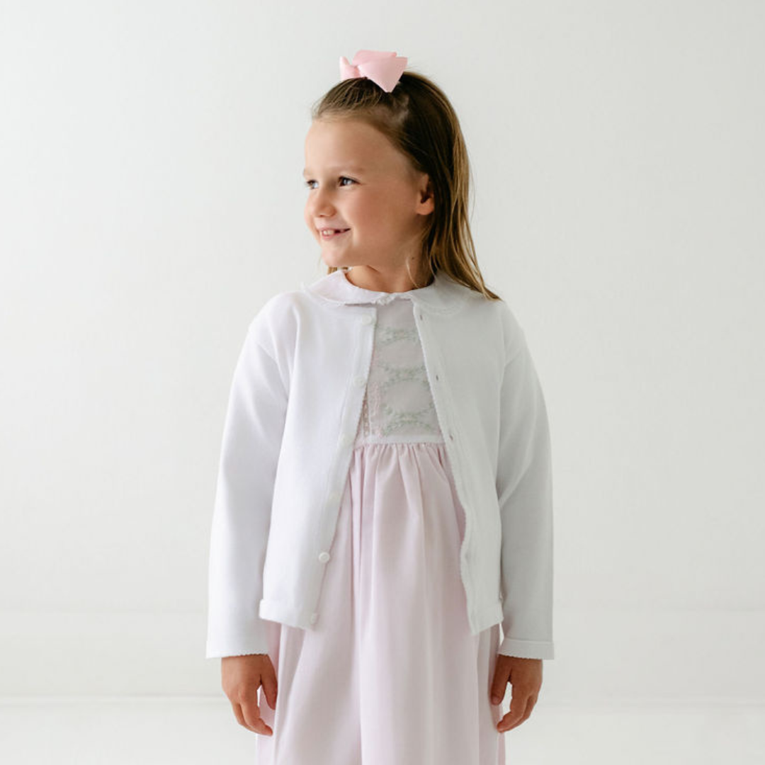 A cardigan as versatile as it is classy! With its soft and warm knit, this cardigan will keep your little one warm and cozy all the time. The perfect piece for layering on top of holiday outfits, special occasion sets, or everyday layette. Crisp, cute, and oh so classy!