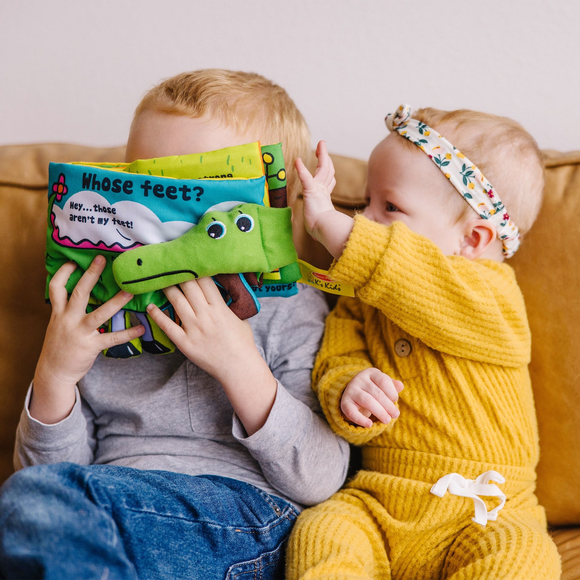 Crocodile can't find his feet! Turn the pages to find out whose feet are down below--and enjoy Crocodile's fancy footwork! This squeaking, crinkling, foot-filled cloth book from Melissa & Doug K's Kids is durably constructed to last through story time, playtime, and the washing machine, too!