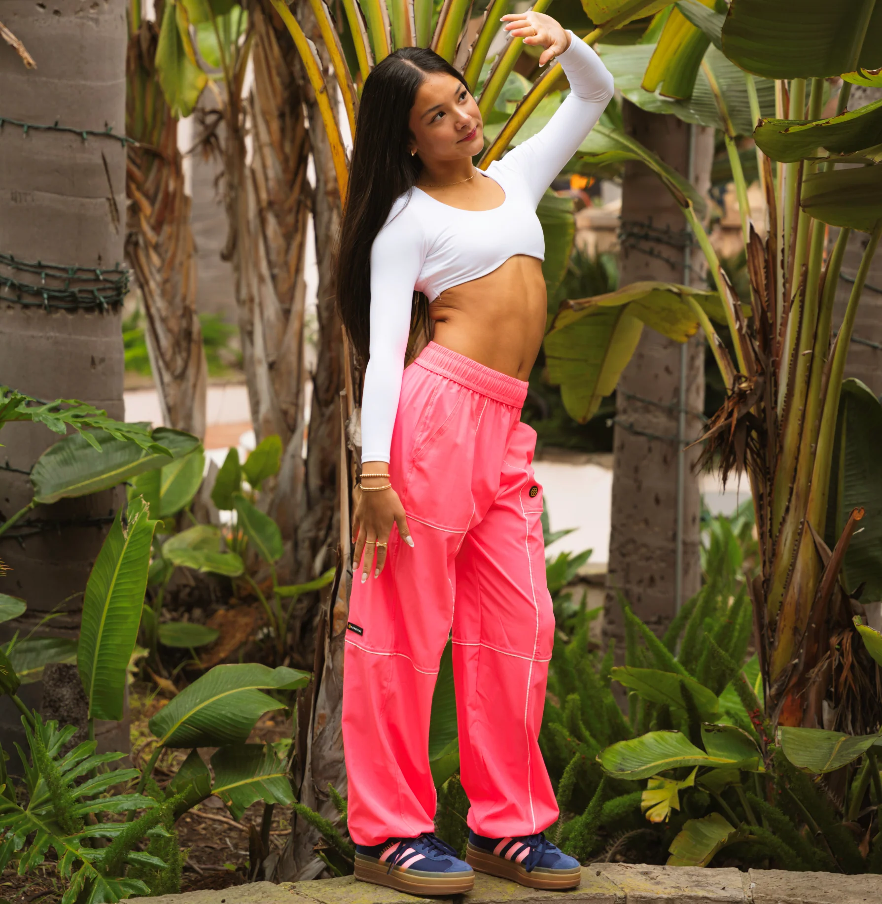 This top will take you to the top of that A-List! Long sleeved crop top with shaped lower front edge and open back. Double lined + interior pad pockets. Sizes AXXS-AM come with removeable pads. Sizes CM & CL do not have pads.