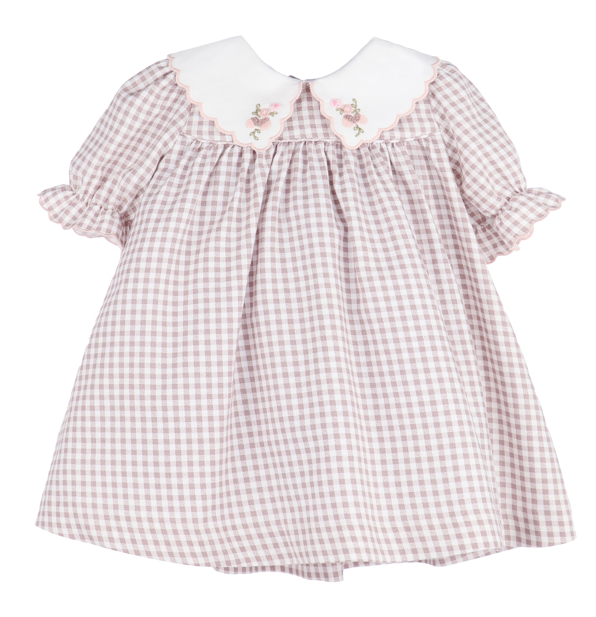 Dress your little one in timeless charm with the Sophie & Lucas Acorn Miller Dress in Brown. Featuring a classic brown gingham print, this sweet dress is adorned with a scalloped white collar delicately embroidered with acorns. The gathered bodice and puffed sleeves with ruffled cuffs add a soft, vintage-inspired touch—perfect for cozy autumn days and special occasions alike.