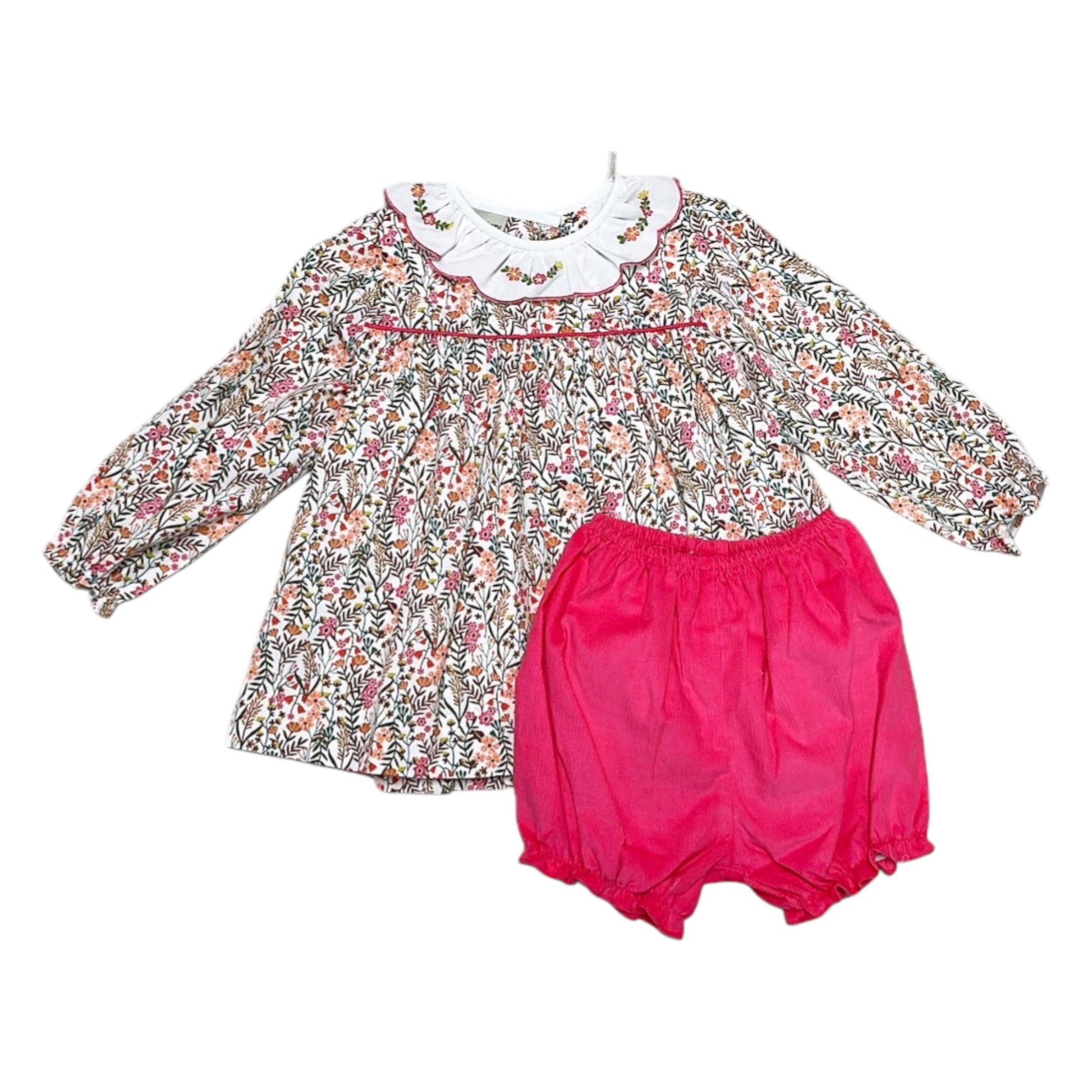 Effortlessly sweet and timeless, this Marco & Lizzy bloomer set brings together cheerful florals and refined details. The long-sleeved blouse features a vibrant floral print in shades of pink, orange, and green, complemented by a crisp white scalloped collar with delicate embroidered blossoms. Elasticized cuffs and a gently gathered silhouette offer both comfort and charm. Paired with coordinating pink bloomers made from soft, breathable fabric, this set is ideal for early fall outings or picture day perfection. Designed with thoughtful craftsmanship and classic appeal, it’s a standout style for the season.