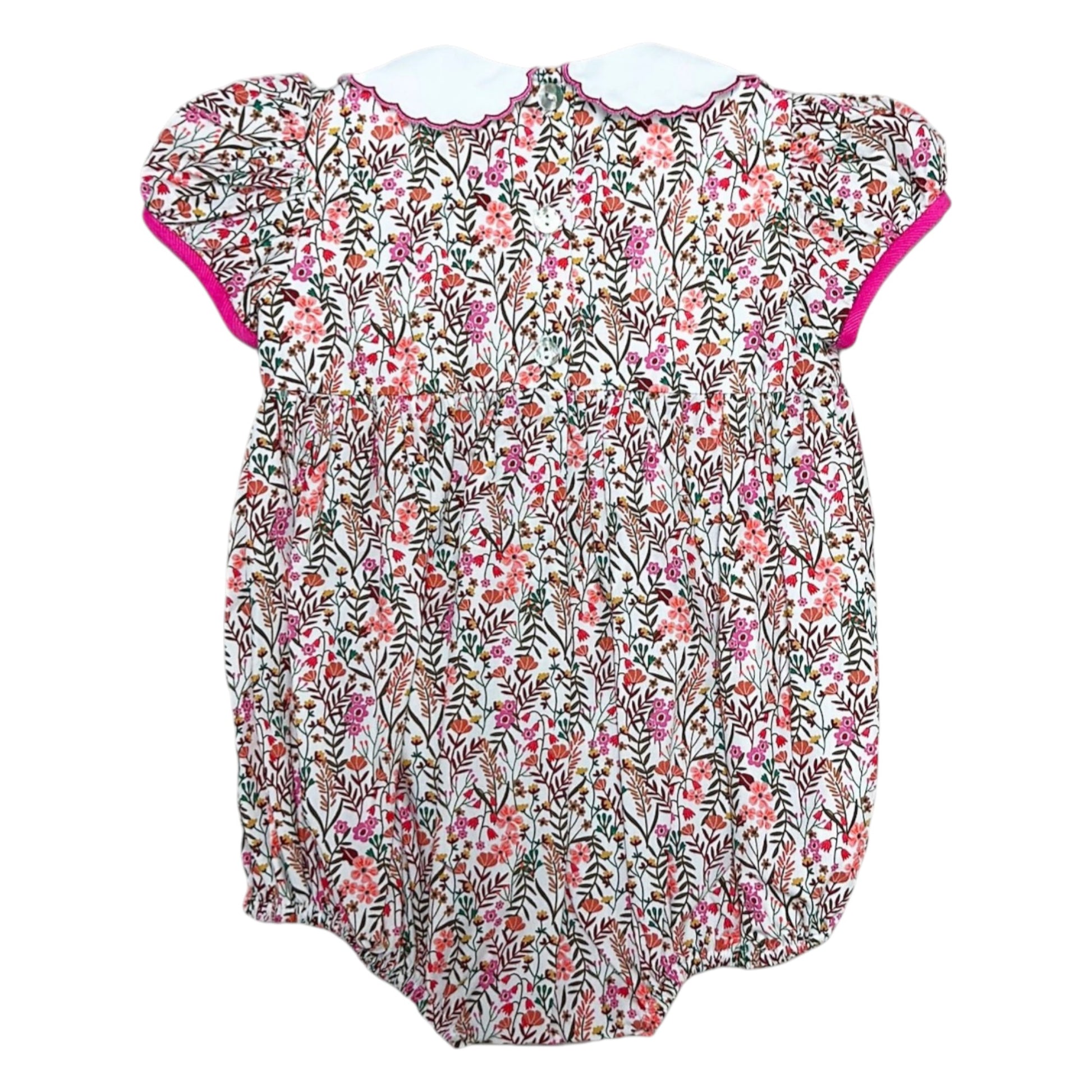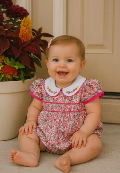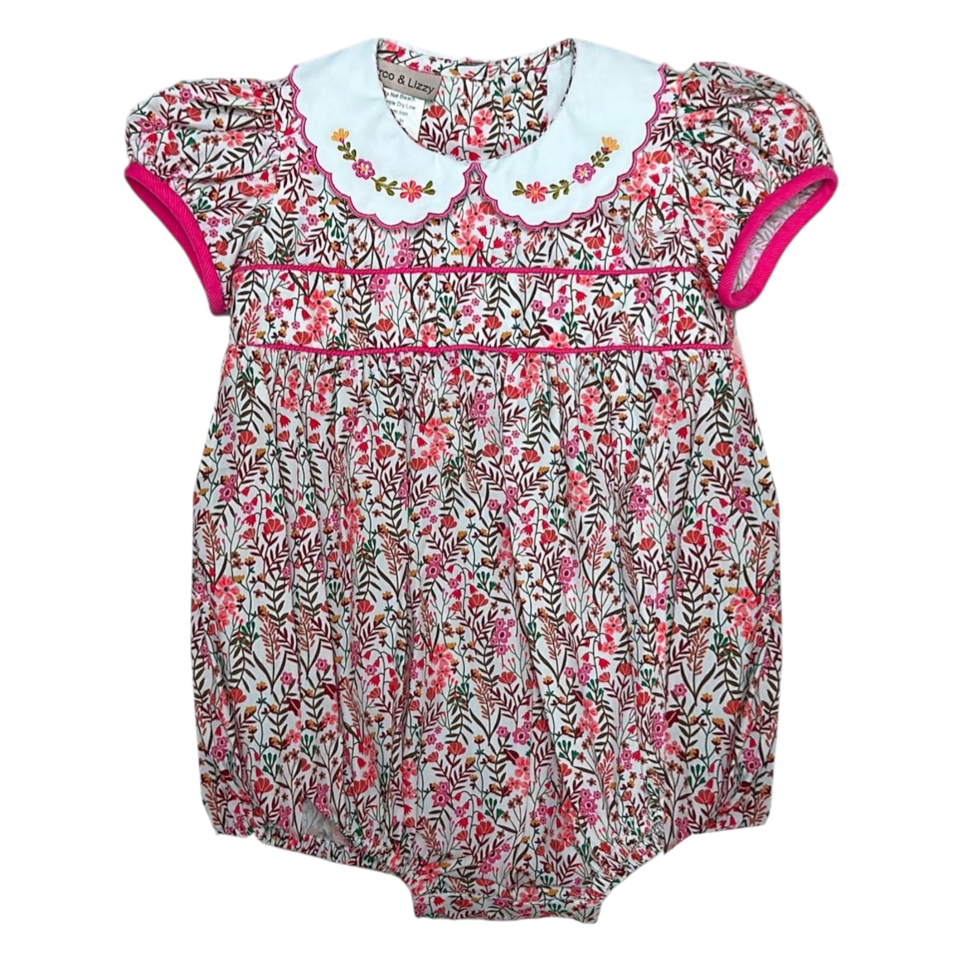 Classic charm meets playful elegance in this coordinating bubble from Marco & Lizzy. Crafted from the same vibrant floral fabric as the matching bloomer set, this silhouette features short puff sleeves trimmed in pink, and a crisp white Peter Pan collar delicately embroidered with tiny blossoms. Soft gathers and elastic leg openings ensure a comfortable fit for little ones on the move, while the heirloom-quality details make it picture-perfect for early fall festivities. Whether worn solo or styled with its matching sibling set, it’s a timeless look that celebrates the joy of childhood.