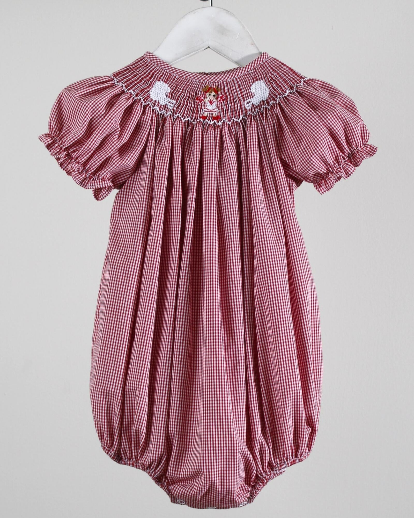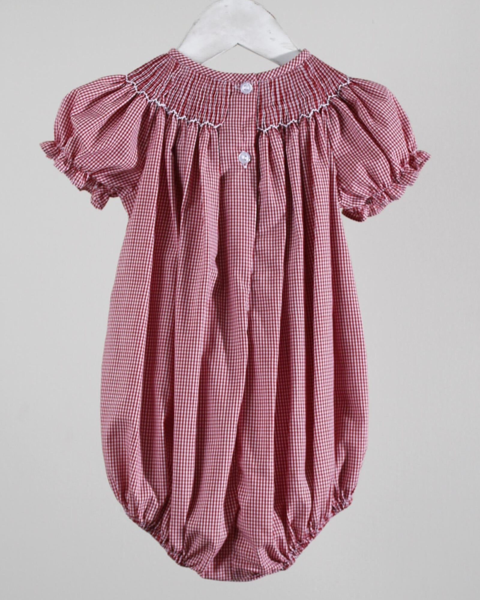 This adorable bubble features classic red gingham fabric and hand-smocked details with football helmets and a spirited mascot—perfect for your littlest fan. With puff sleeves, a comfy bubble fit, and easy button-back closure, it’s a must-have for cheering on the Hogs! ❤️🐗