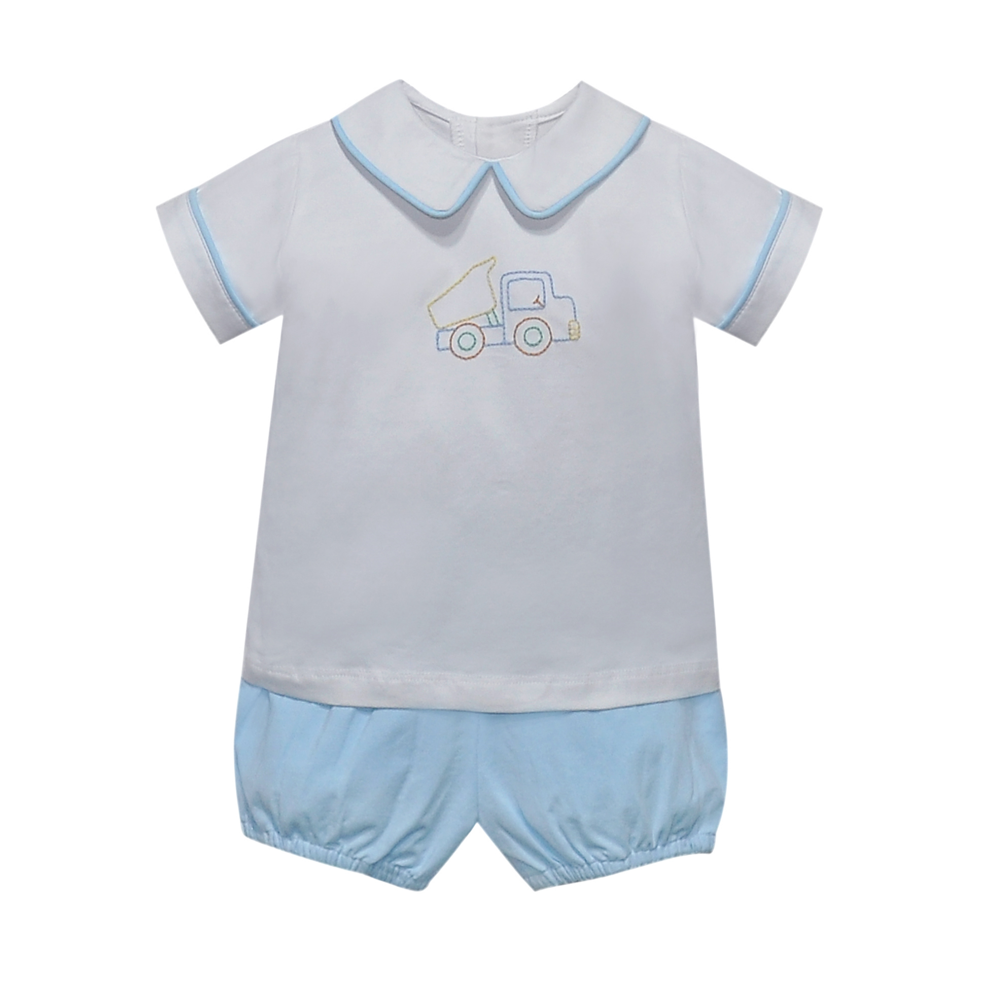 Ride into style with Baby Sen's Aubrey Short Set featuring playful truck embroidery. This boy's short set is perfect for any adventure, providing comfort and coolness for all-day fun. Truck-load of style and comfort, ready to hit the road!