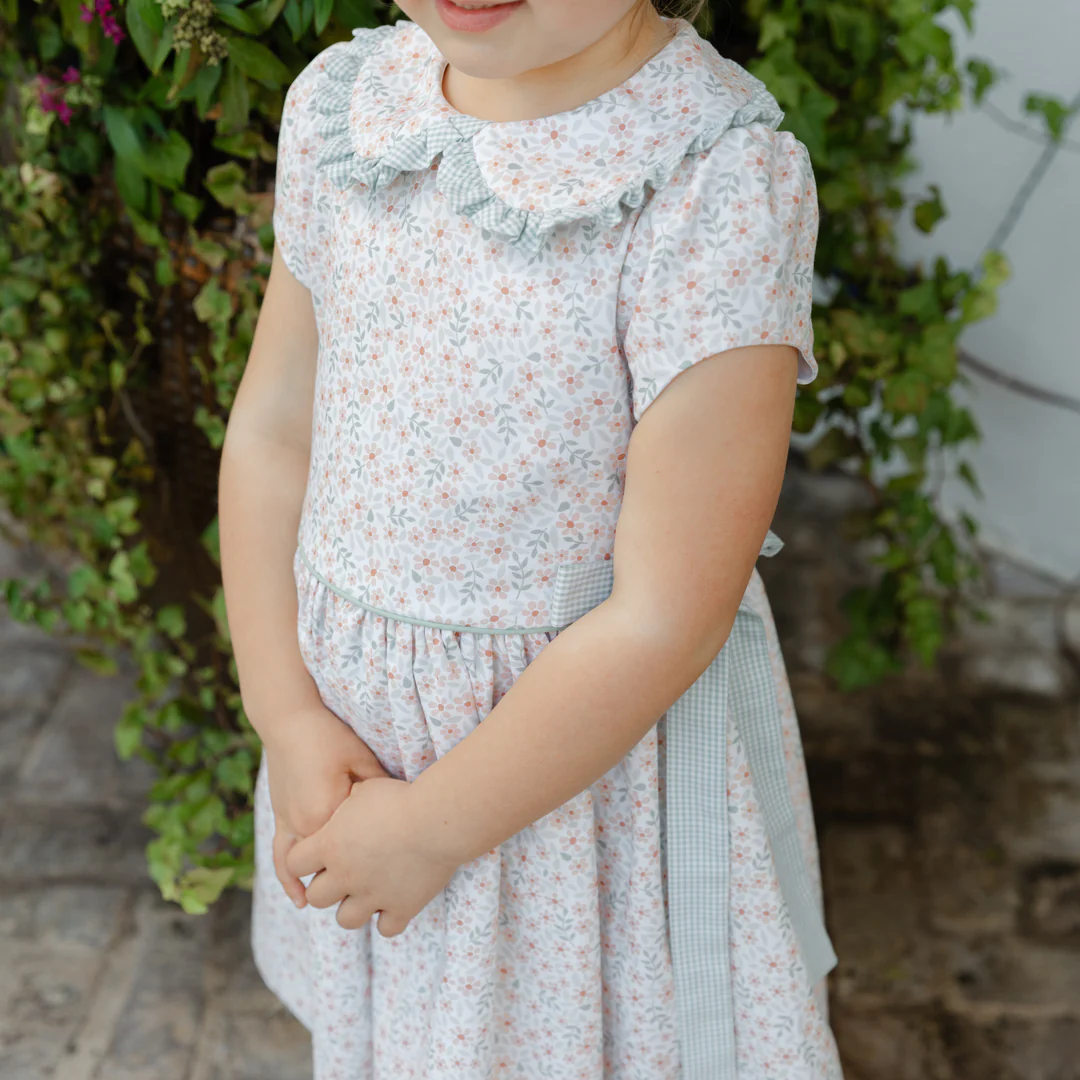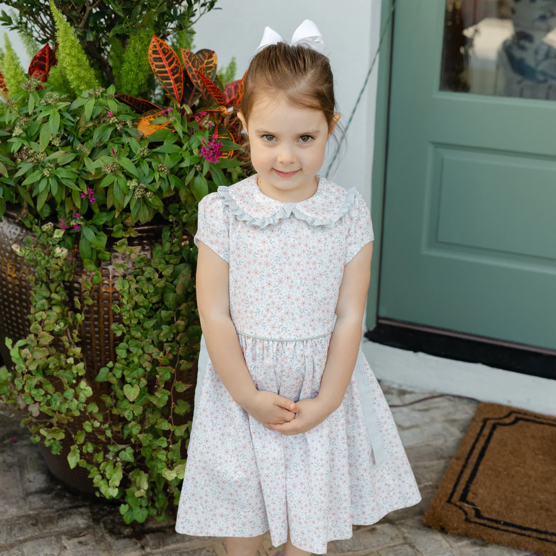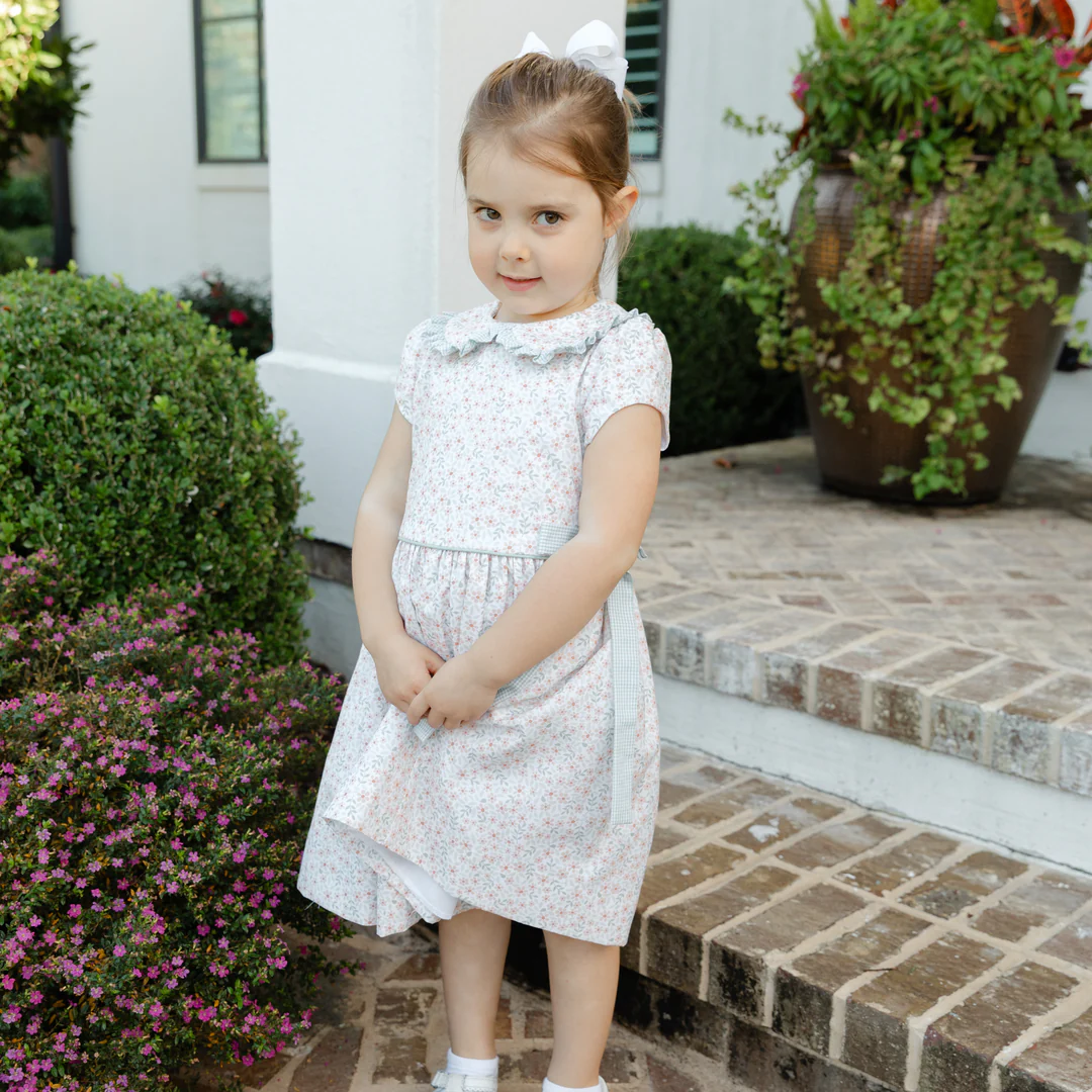 Classic charm meets seasonal sweetness in the Autumn Blooms Dress from Bailey Boys. With its dainty orange and green floral print, ruffled Peter Pan collar, and green gingham side bows, this dress is made for crisp fall days and picture-perfect moments.