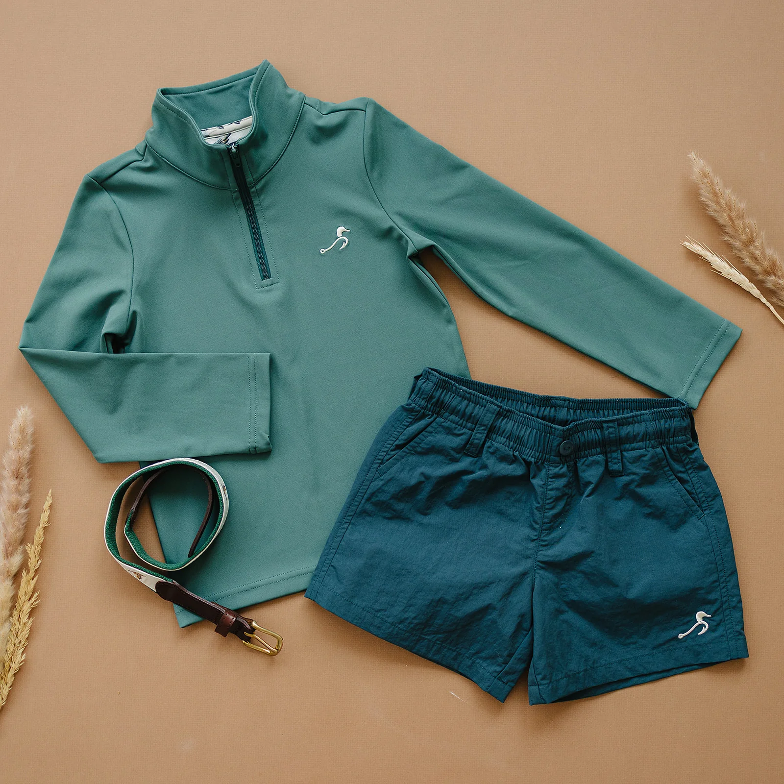 Built for cool mornings and sunny afternoons, the Beau Quarter Zip is a lightweight performance layer crafted with UPF 50+ protection and breathable comfort. Made in mallard green, this pullover is perfect for layering on outdoor adventures. It keeps your little guy protected, comfortable, and ready for whatever the day brings. Features 'mallard sky' mallard print at inner collar.