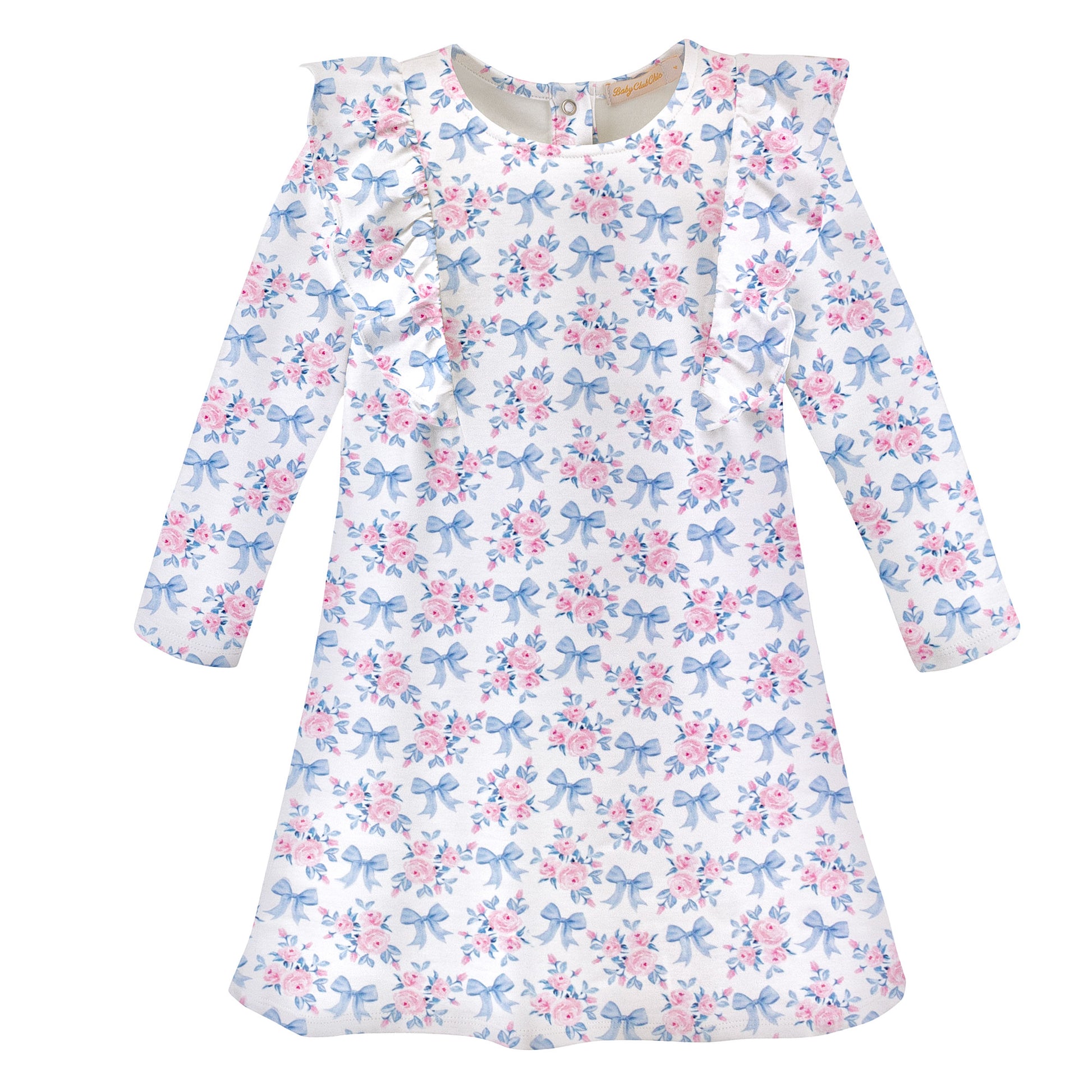 Let her bloom in timeless beauty with this Baby Club Chic Long Sleeve Dress, adorned in a delicate white base with pink florals and blue bows. Ruffled shoulders and a classic round neckline add heirloom charm, while the soft fabric ensures all-day comfort. Perfect for portraits, parties, or simply twirling through the day.