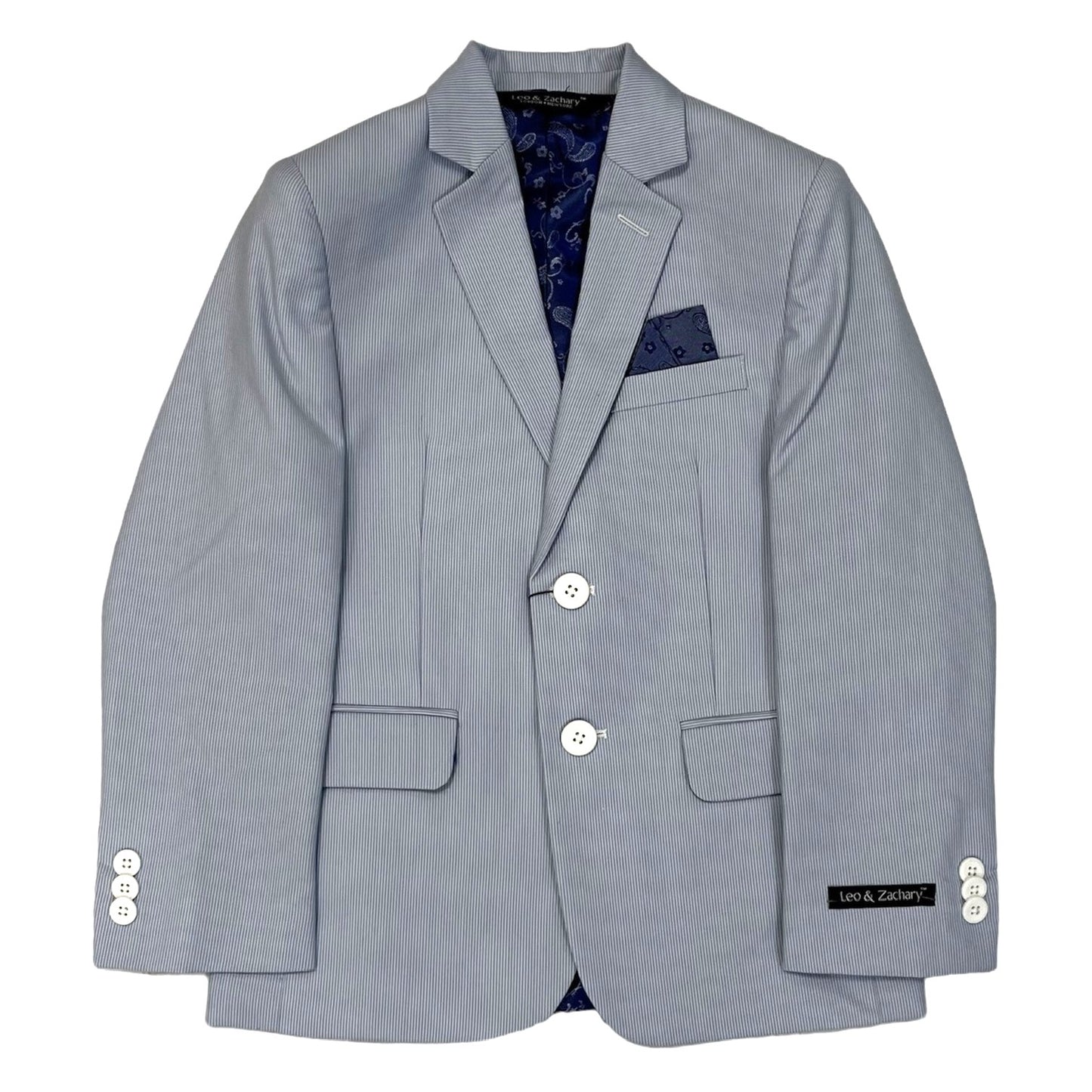 Elevate your young gentleman’s wardrobe with this stylish boy’s blazer. Crafted from a high-quality fabric blend, this blazer features a classic herringbone pattern in shades of blue and white, offering a timeless look with a modern twist. The notched lapel collar adds sophistication, while the contrasting striped sleeve ends and pocket trims provide a touch of playful elegance.