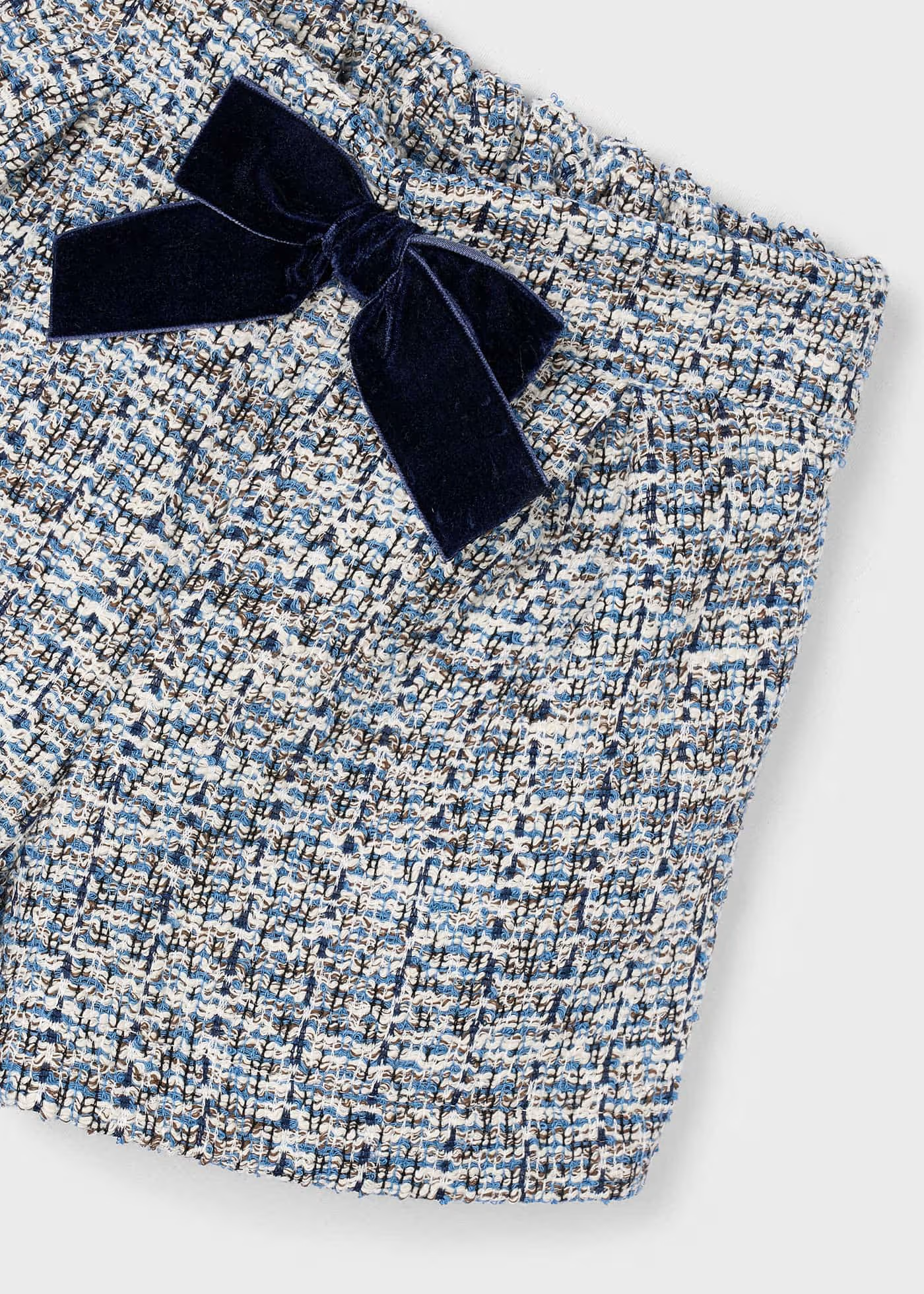 These elegant Mayoral shorts are crafted from a soft tweed fabric featuring a harmonious mix of blues, beige, and ivory threads, giving them a refined, textured look. A stretch waistband ensures a snug yet gentle fit, while a rich navy velvet bow adds a graceful touch at the center. Ideal for crisp fall days, school picture moments, or dressing up for family outings, they’re both versatile and timeless. Pair them with knit tops, tights, or Mary Janes to complete a polished cold-weather look with a hint of sophistication.