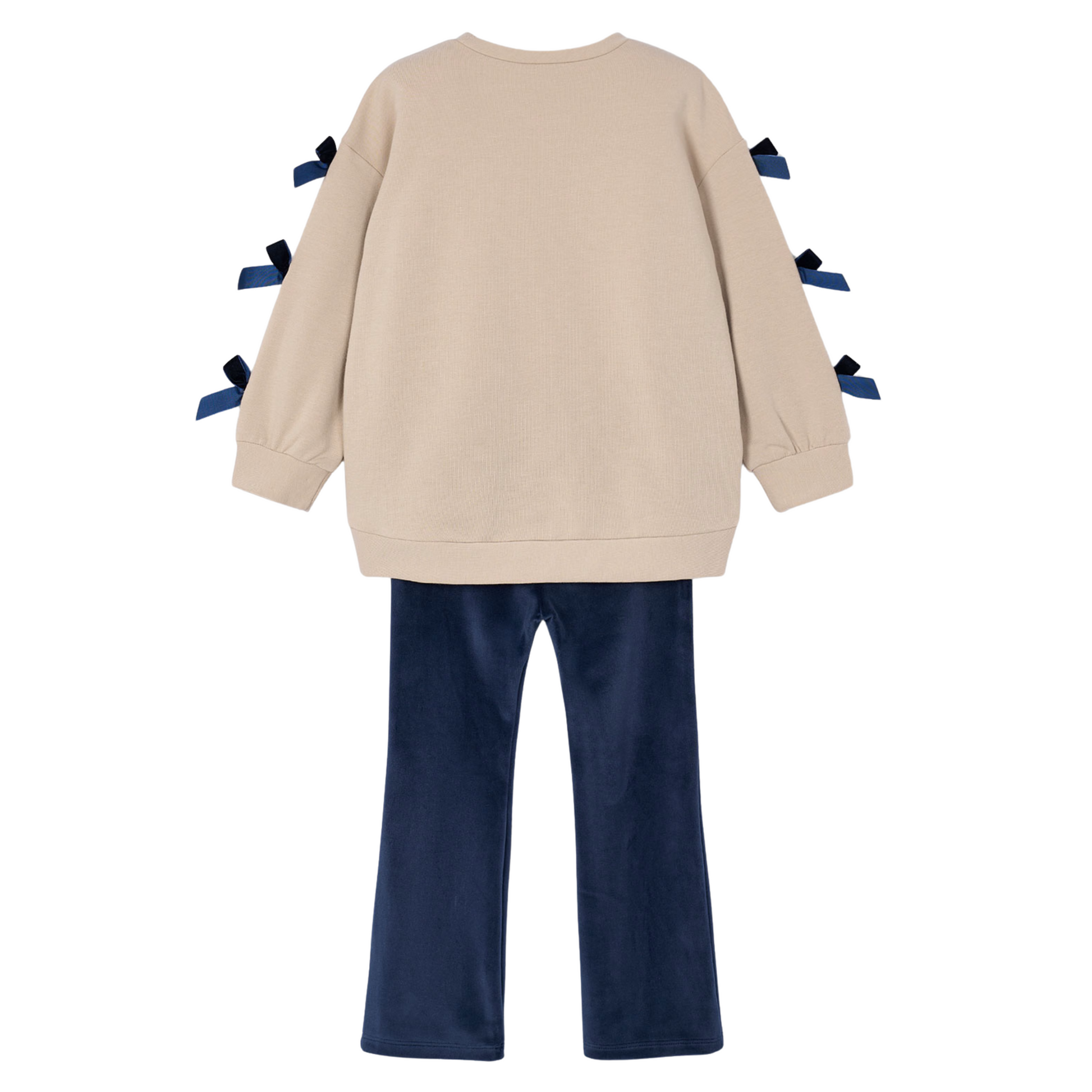 The Bow Sweater Legging Set in navy from Mayoral is a charming blend of cozy comfort and elevated style. Designed with playful sophistication in mind, this two-piece outfit features a beige oversized sweater adorned with dark navy bows cascading down the sleeves—adding a whimsical touch to a classic silhouette. Paired with velvety navy leggings that offer both softness and structure, this set is perfect for everyday outings or dressier occasions where comfort doesn’t compromise style.