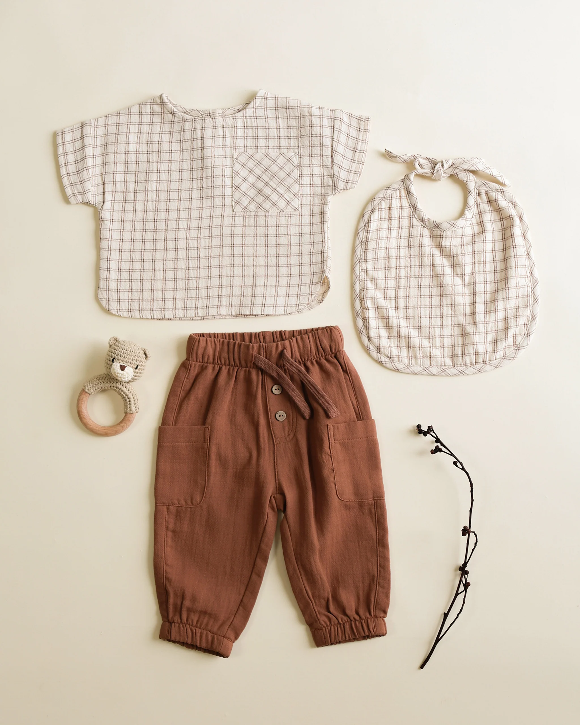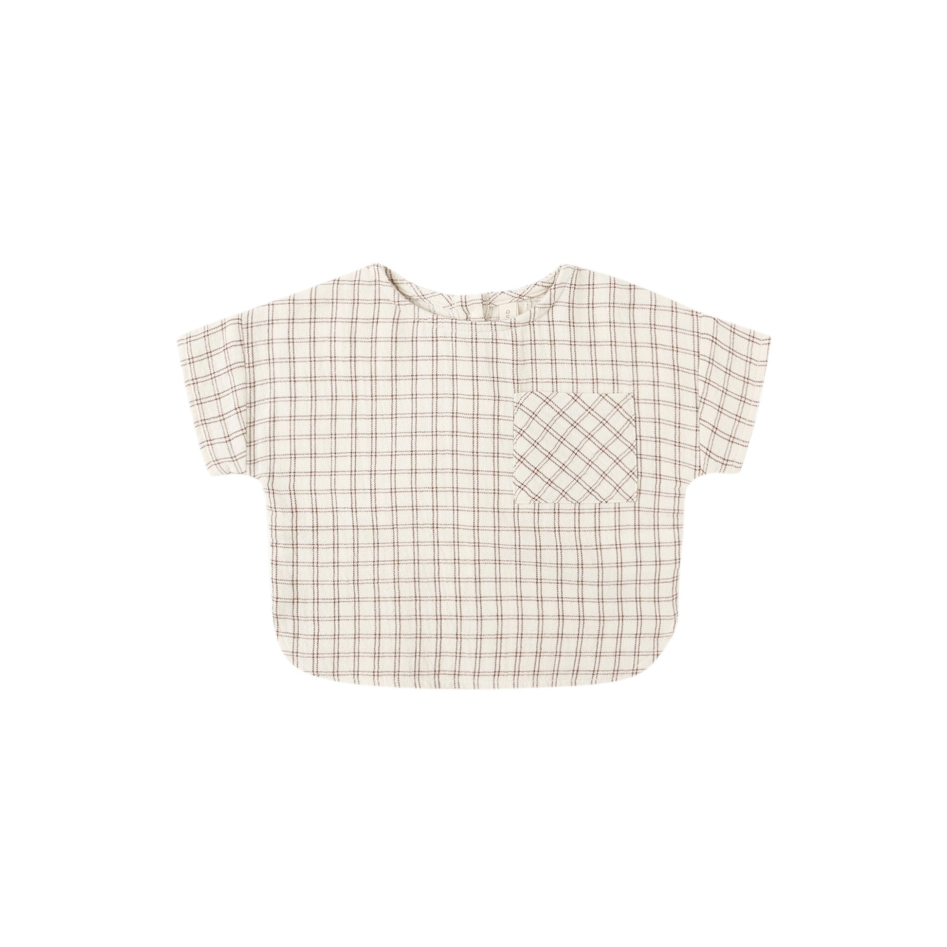 Woven boxy-fit top featuring a front chest pocket and back coconut button placket for easy on and off.