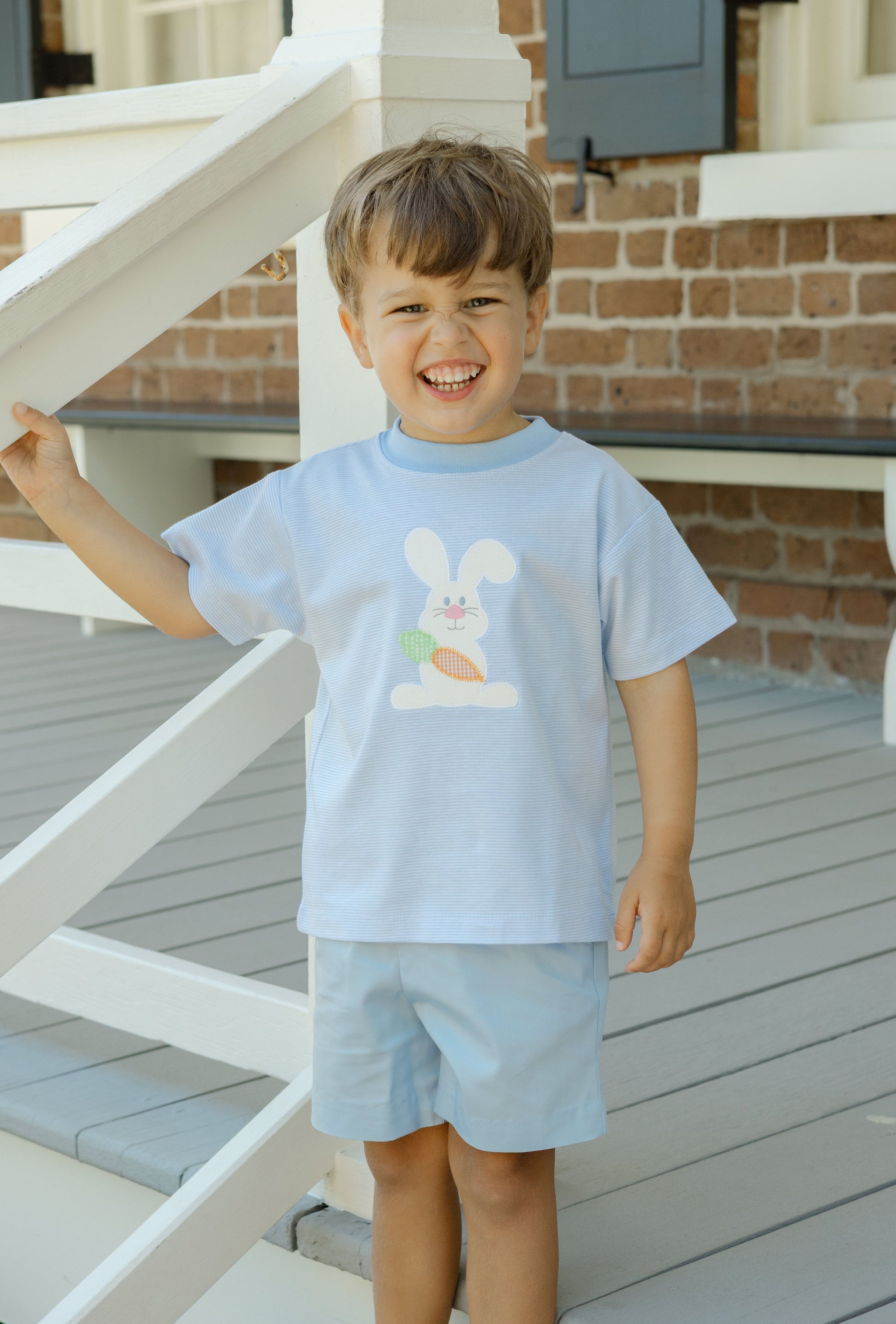 The Little Hare Boys Short Set is made for Easter joy and family portraits. Sweet bunny embroidery decorates the soft cotton shirt, while coordinating shorts complete the look. Lightweight fabric keeps him comfy during church or springtime play. A charming outfit for timeless photos.