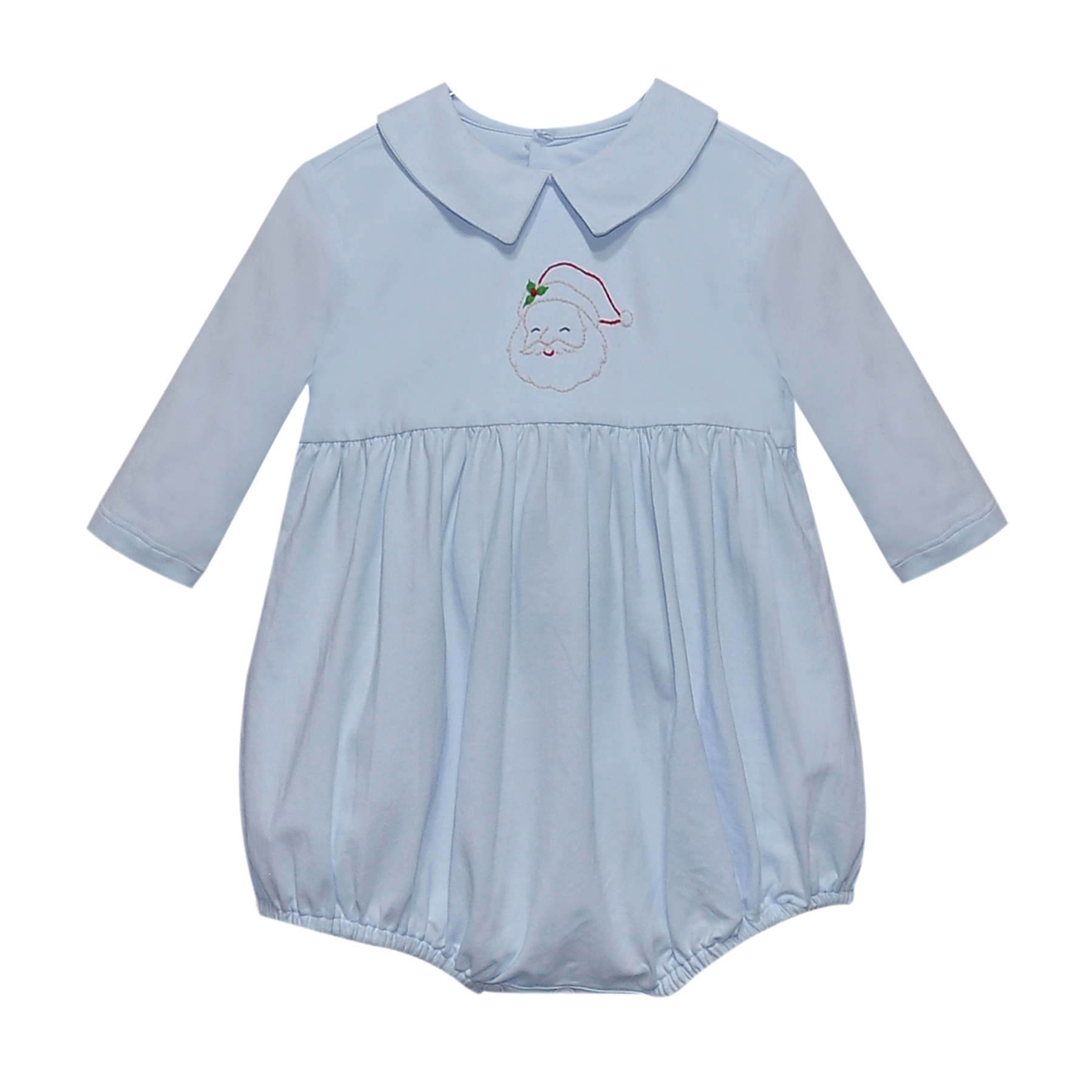This light blue romper brings frosty fun to your baby’s holiday wardrobe, featuring a sweet embroidered Santa face topped with holly cheer. A crisp white Peter Pan collar adds a touch of vintage charm, while gathered legs and puffed sleeves keep comfort front and center for festive cuddles and Christmas morning giggles.