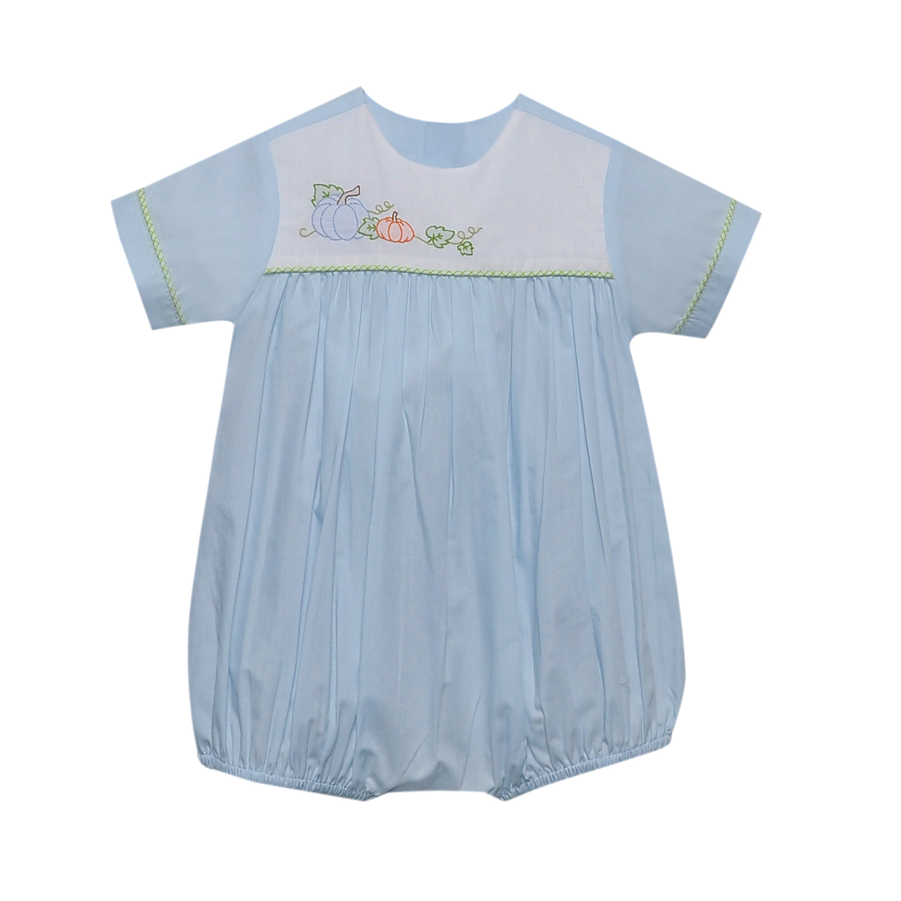 Dress your baby in a season of smiles with this light blue bubble from Remember Nguyen, featuring a delicately embroidered yoke of pastel pumpkins and swirling leaves. With fluttery sleeves and elastic leg openings, it’s designed for cozy comfort and vintage charm. Green scalloped trim adds a soft pop of color that hints at garden strolls and fall magic.
