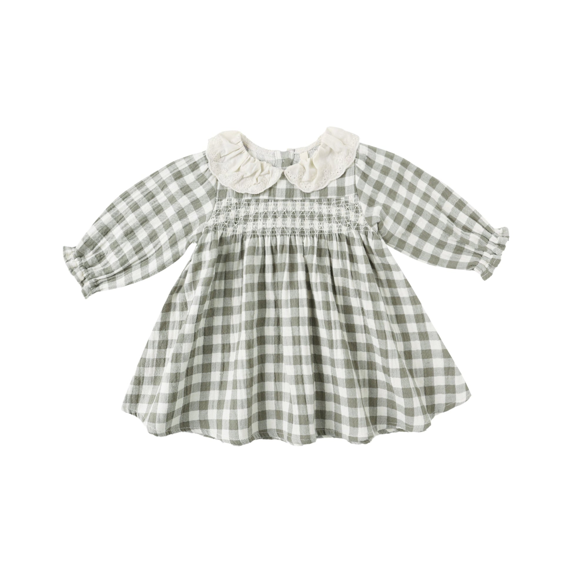 Quincy Mae's Callie Dress features a darling contrast eyelet collar, smocked front bodice, gathered skirt, and ruffle sleeves, with buttons at the back for easy dressing. Matching bloomers included with all sizes.
