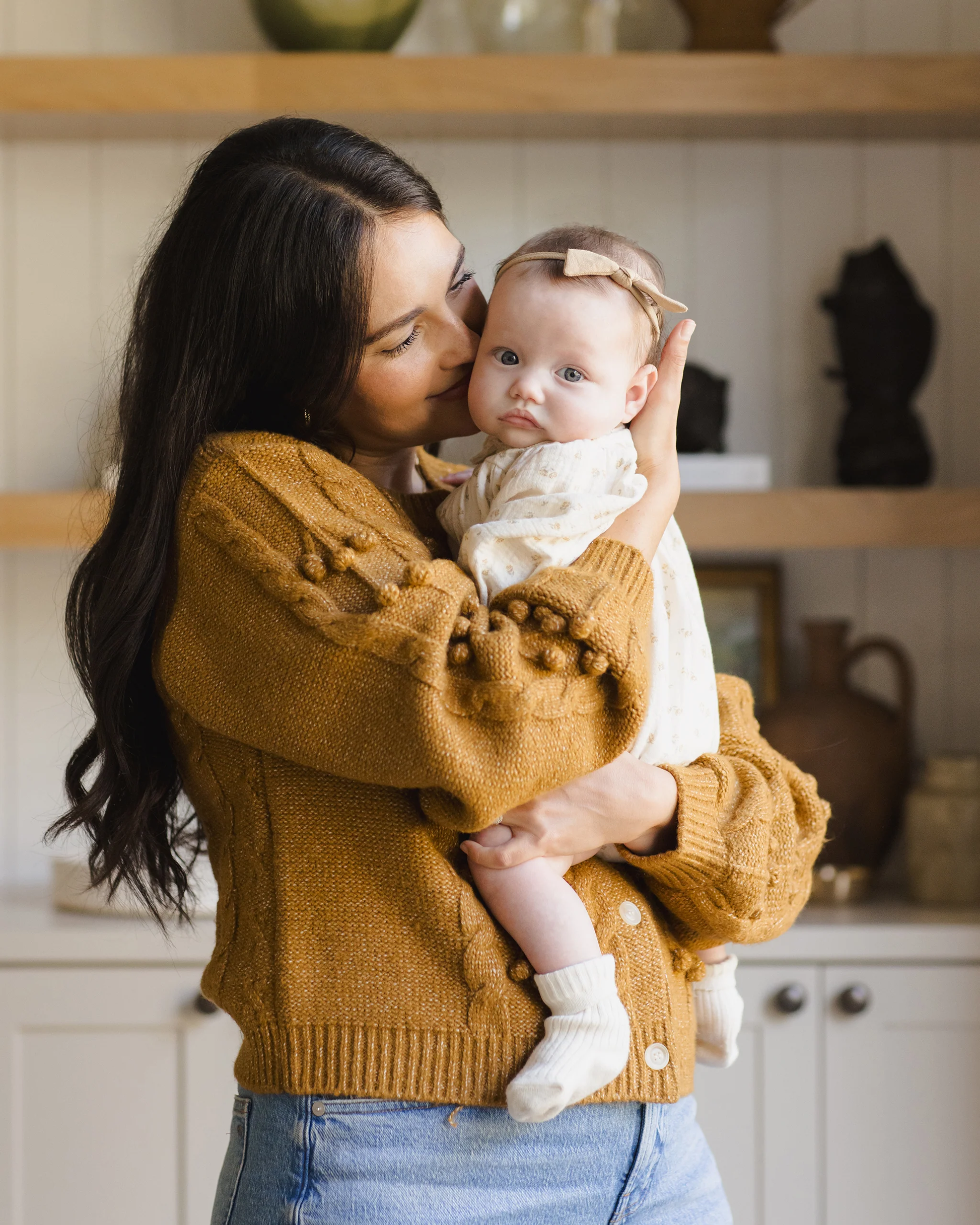 Quincy Mae's Callie Romper features a sweet embroidered collar, smocked front, and gathered long sleeves. Buttons at the back and snaps at the bottom make for easy dressing.
