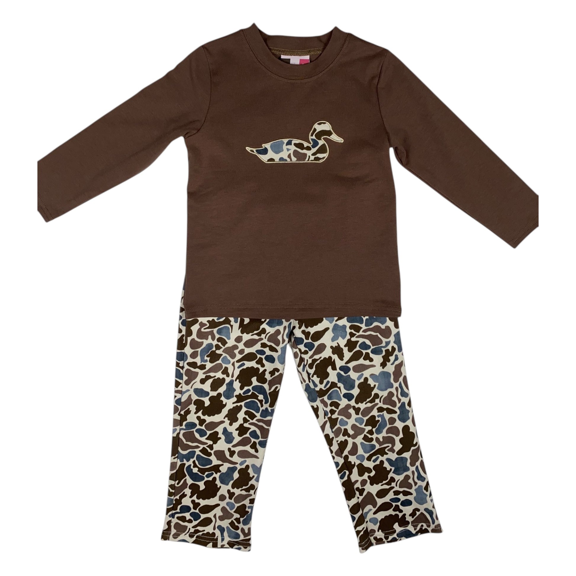 Quirky and coordinated, this camo duck set from Banana Split blends rustic charm with playful personality. The long-sleeved brown top features an appliqué of a duck—stitched with soft camouflage textures in earthy tones of beige, blue, and brown—bringing woodland whimsy to everyday wear. Matching pants with an allover camo print complete the look, crafted for comfort and adventure-ready ease. Perfect for fall strolls, campfire cuddles, or sibling snapshots in the great outdoors, it’s a standout style that waddles into seasonal fun.