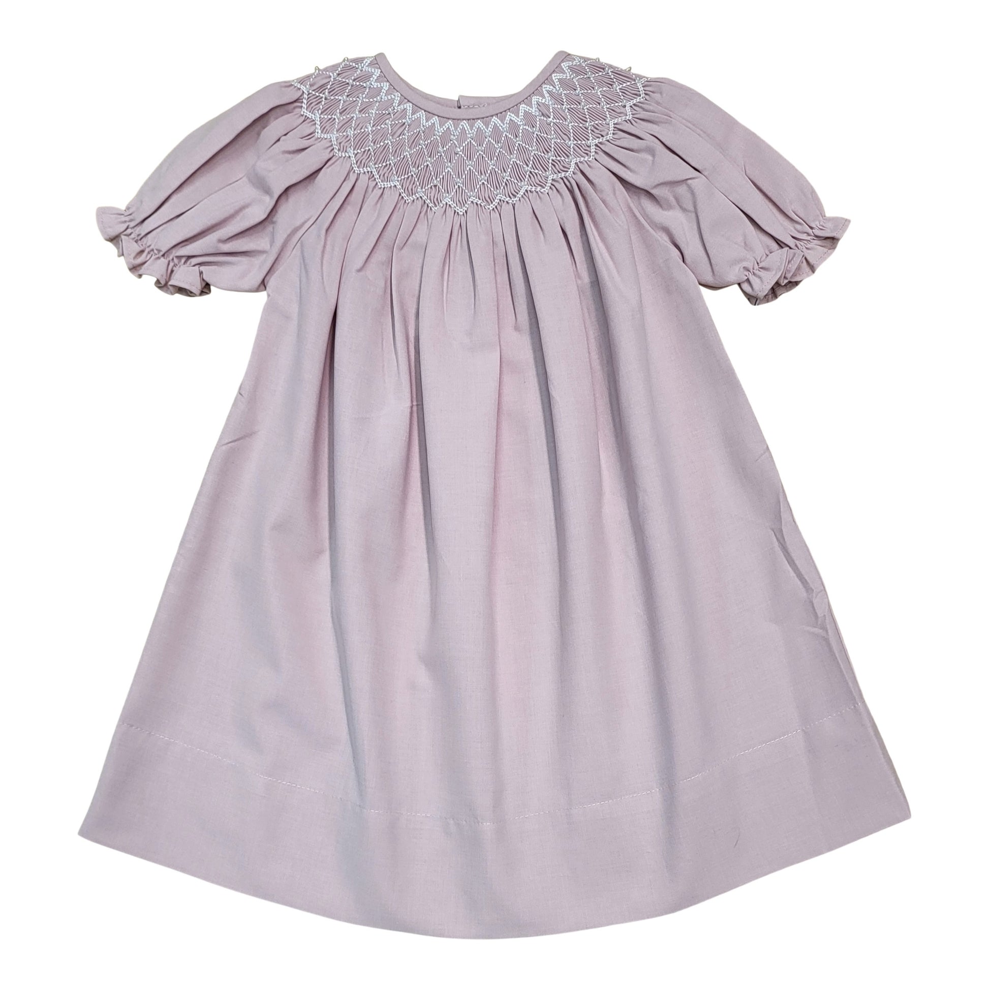 The Catherine Dusty Pink Smocked Dress with White Pearls from Sweet Dreams is a soft and elegant statement piece, perfect for heirloom portraits and seasonal celebrations. Crafted in a muted dusty pink hue, this dress features a delicately smocked neckline adorned with white pearl embroidery in a classic diamond pattern. Puffed sleeves with matching smocking and ruffled cuffs add a graceful finish, while the full skirt offers timeless charm and twirl-worthy volume.