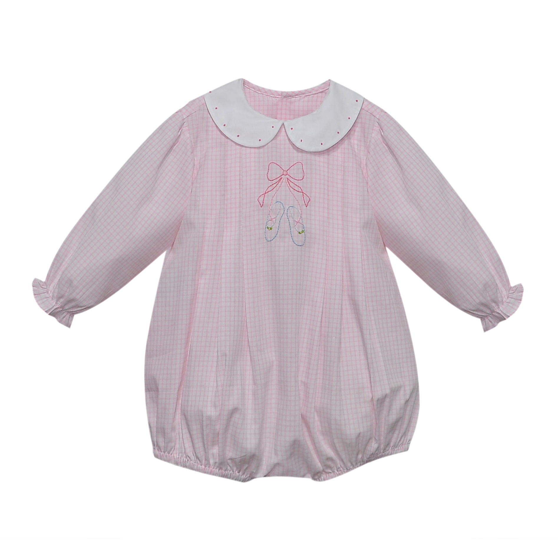 Keep your little one stylish and comfortable in Baby Sen's Cayden Bubble! This pink gingham long sleeve bubble features a sweet white Peter Pan collar and adorable ballet shoe embroidery, perfect for your little ballerina. Made with quality materials, it's the perfect addition to any baby girl's wardrobe.
