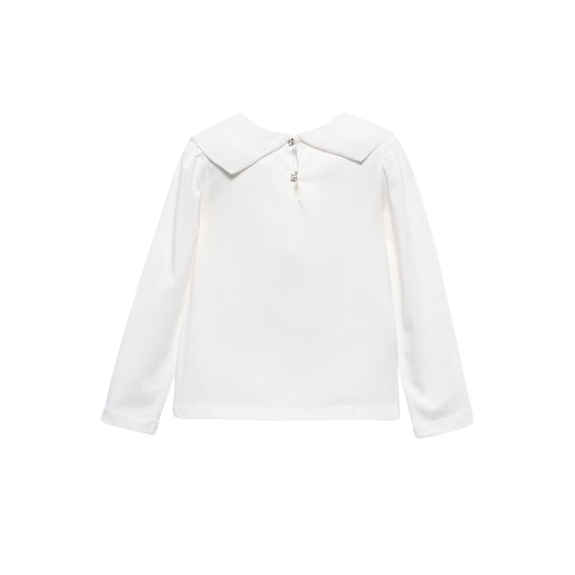 The Chiffon Bow Collar Blouse from Abel & Lula is a graceful piece that blends timeless elegance with playful charm. Made from lightweight ivory chiffon, this long-sleeved blouse features an oversized scalloped collar trimmed in black and finished with a delicate black bow at the neckline. The soft lining ensures comfort, while the concealed button fastenings maintain a clean, refined silhouette—perfect for pairing with tweed skirts, tailored shorts, or layered under festive outerwear.