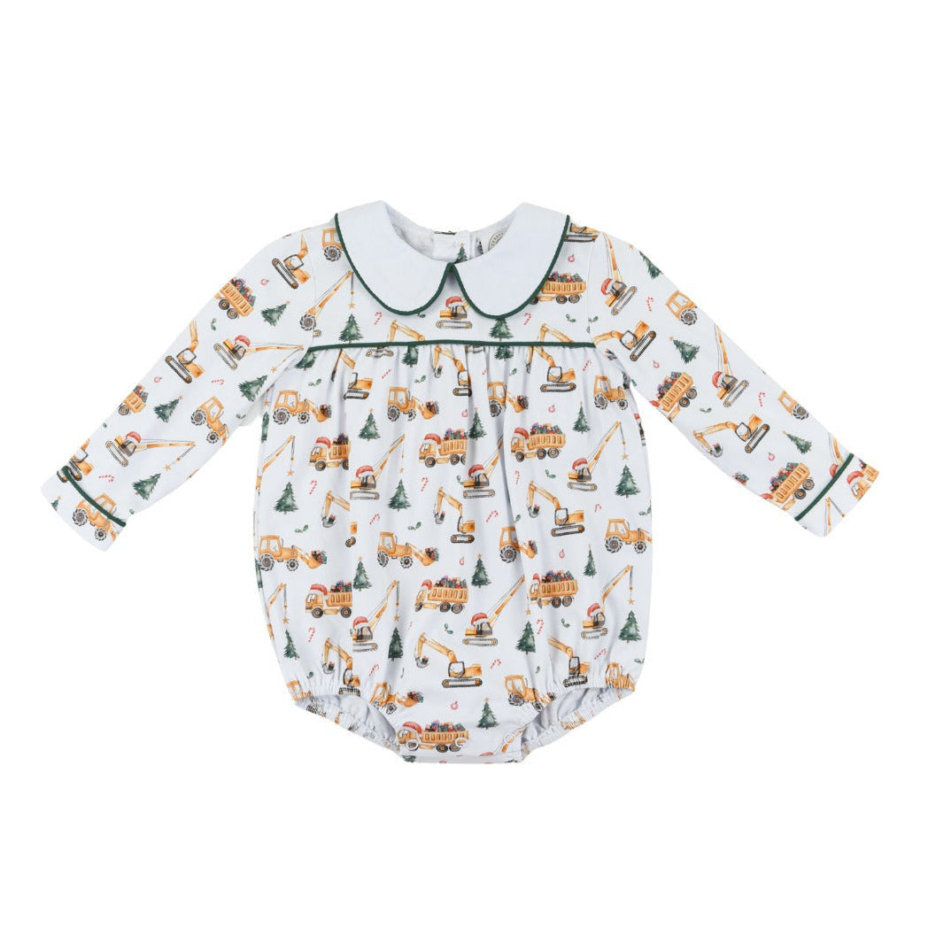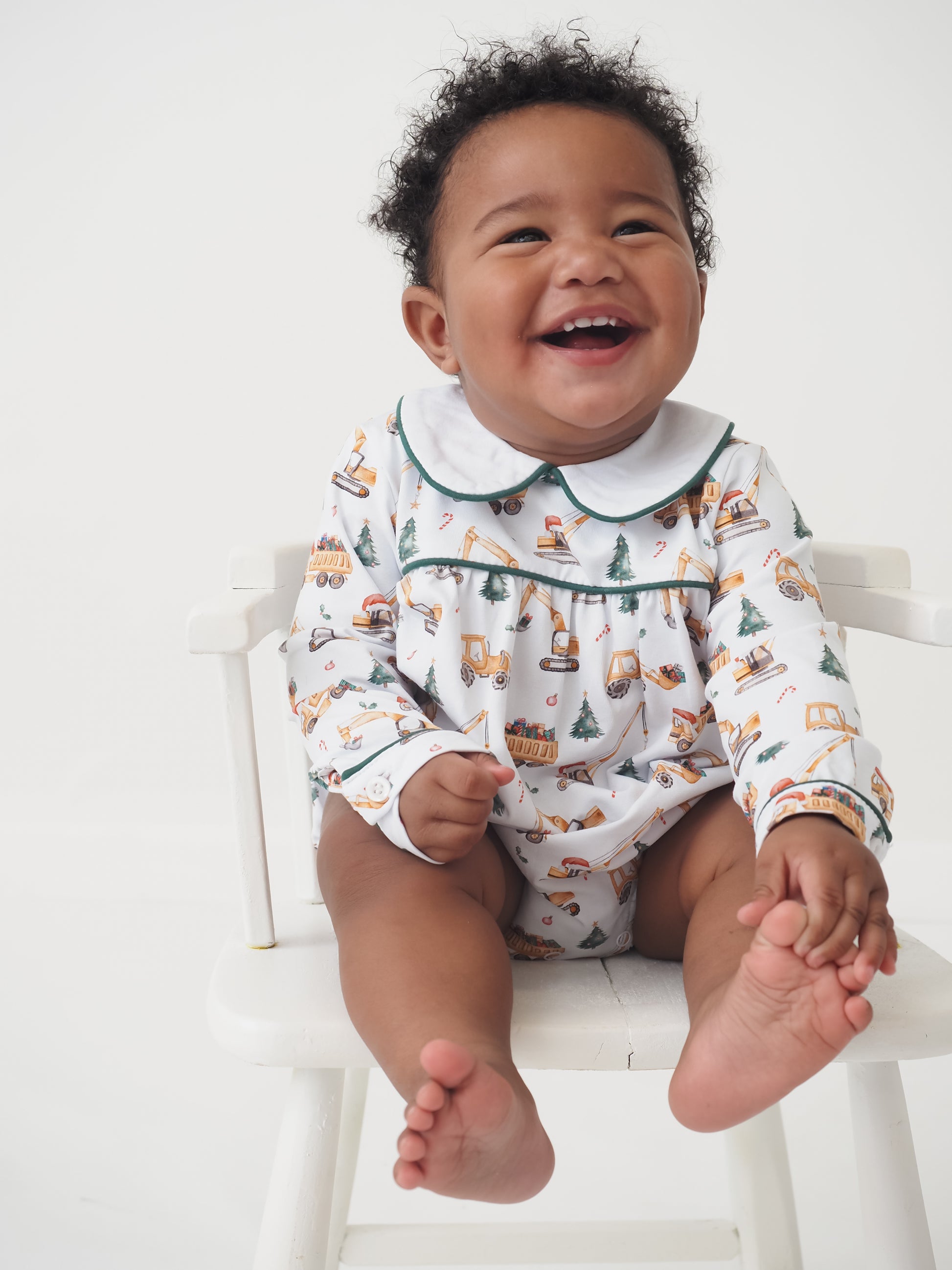 The Christmas Construction Bubble from Cypress Row is where holiday cheer meets hard hat hustle 🎄🚧. Designed for your little builder-in-training, this festive romper features a playful parade of illustrated excavators, dump trucks, and cement mixers—all decked out for the season with trees, cones, and a sprinkle of yuletide magic. The crisp white base lets the whimsical print shine, while the dark green Peter Pan collar adds a classic touch with a hint of pine-tree charm.