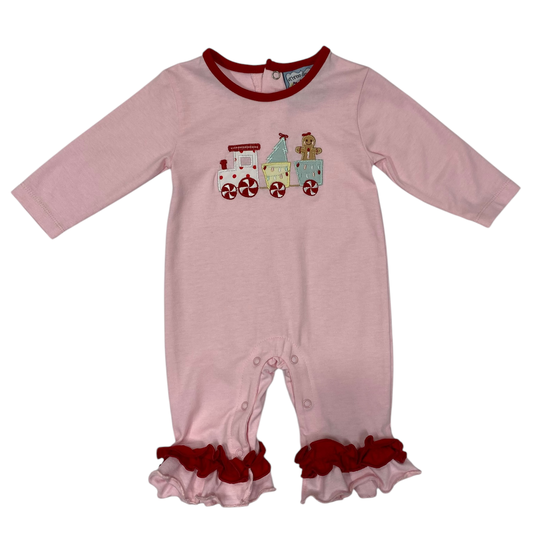 All aboard the cozy express! This long-sleeved pink romper from Three Sisters features a cheery embroidered train chugging across the chest, complete with festive colors and a cuddly gingerbread girl in tow. Red trim at the neckline and ruffled cuffs add holiday pop, while the soft knit fabric keeps her warm through cocoa sipping and sleigh bell giggles. With snap closures for easy changes, it’s the perfect ensemble for joyful journeys big and small.