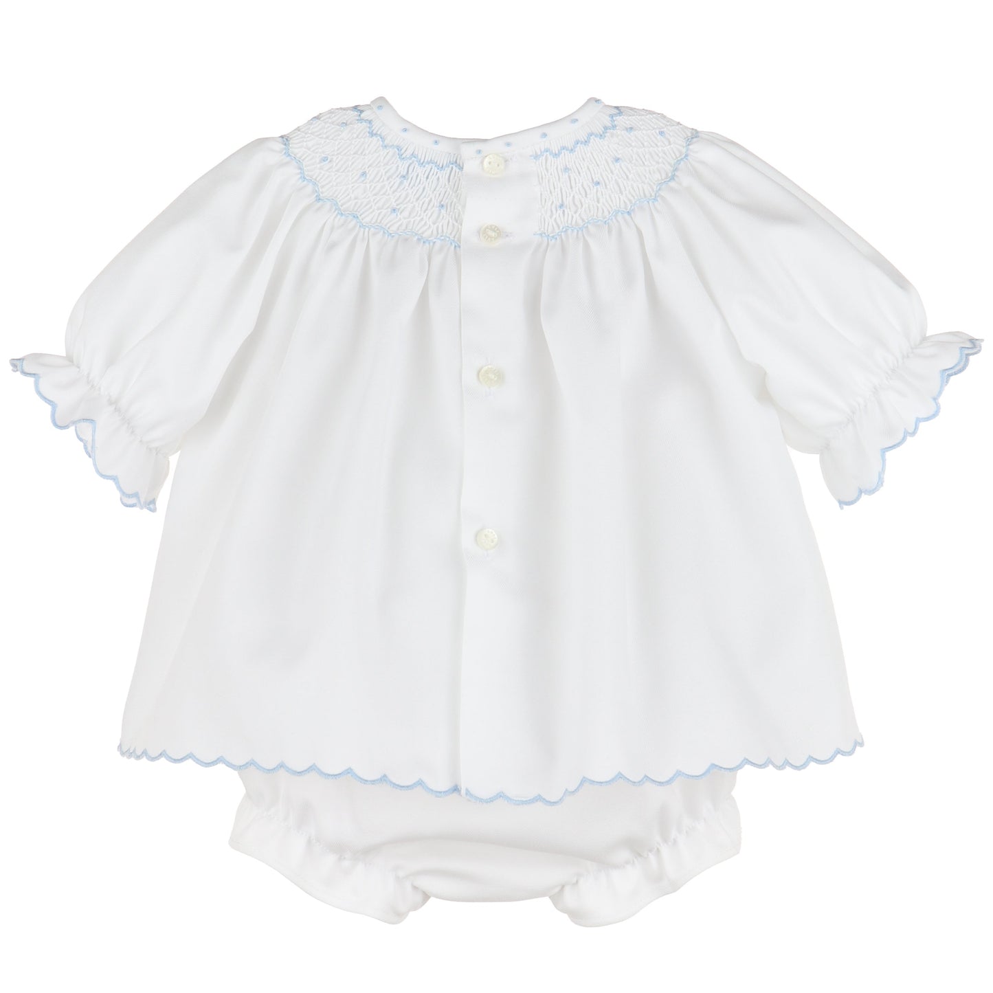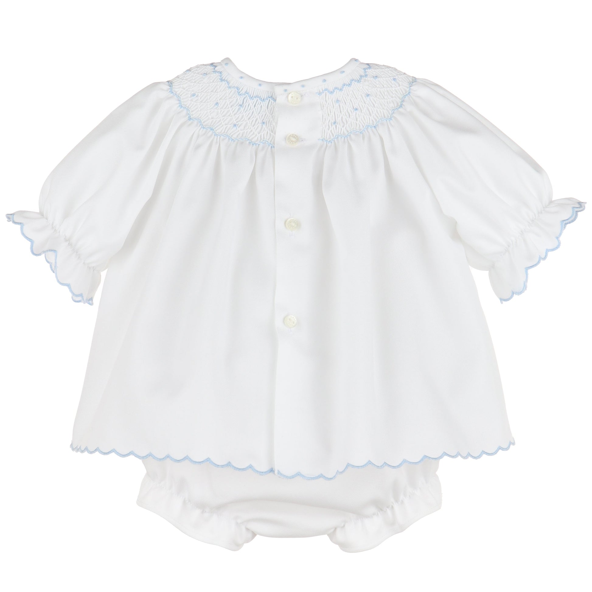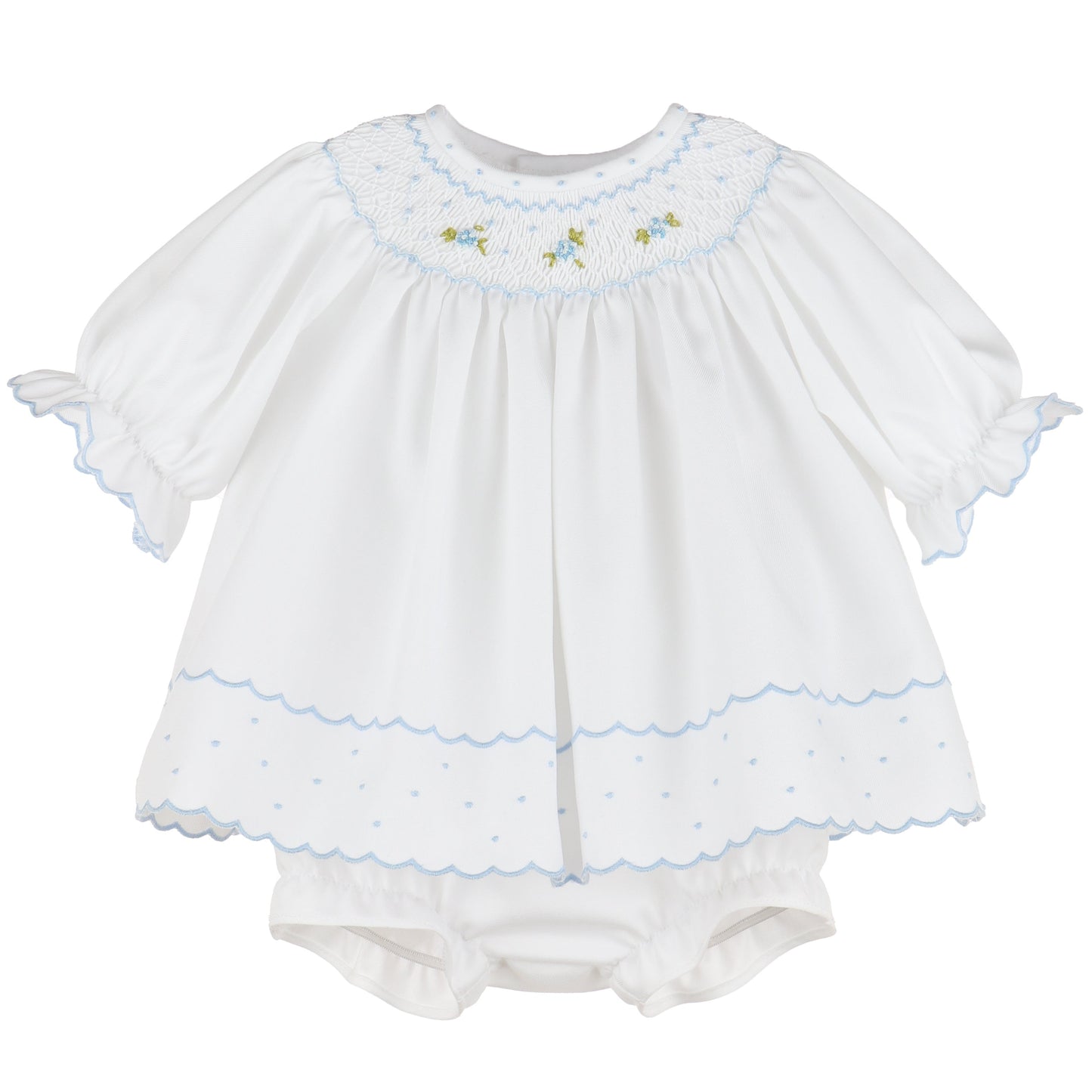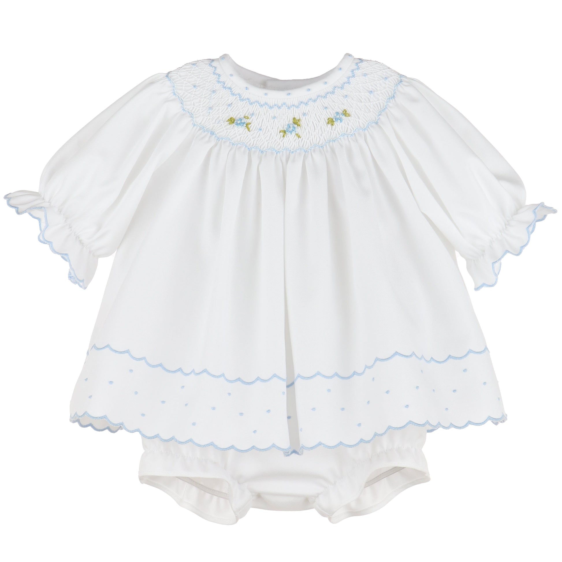 Delicate and angelic, this Luli & Me white smocked dress with bloomers is the epitome of timeless baby elegance. Featuring light blue hand-smocking adorned with petite yellow and green floral embroidery, the yoke and scalloped hemline bring soft charm to this classic silhouette. Gently puffed sleeves with ruffle trim and coordinating scalloped edges complete the sweet, heirloom-quality design. Perfect for christenings, special occasions, or spring portraits, this outfit captures the innocence and grace of babyhood in the most beautiful way.