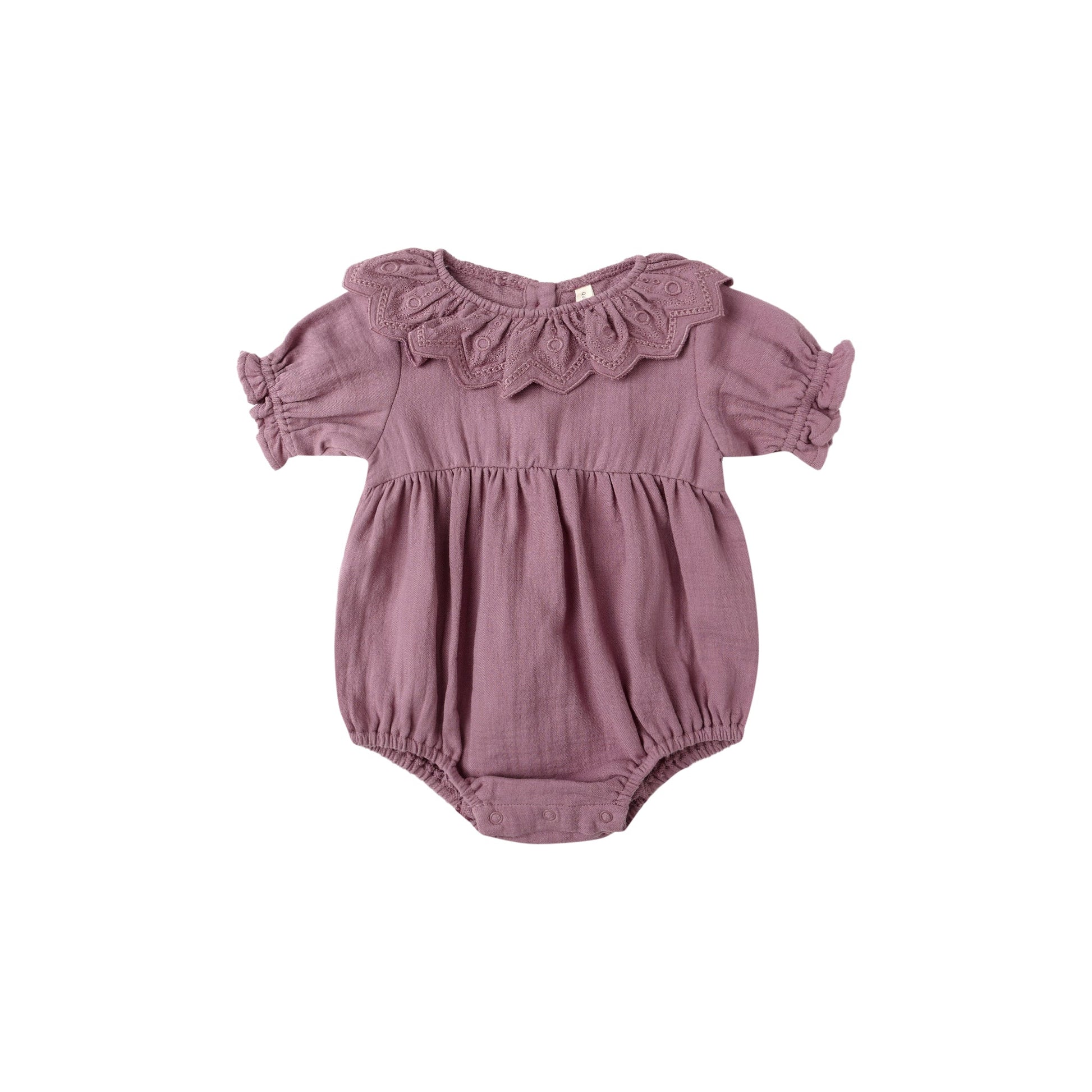 A sweet romper with a collar, short puff sleeves, and ruffle details, finished with back buttons and bottom snaps for easy changing.