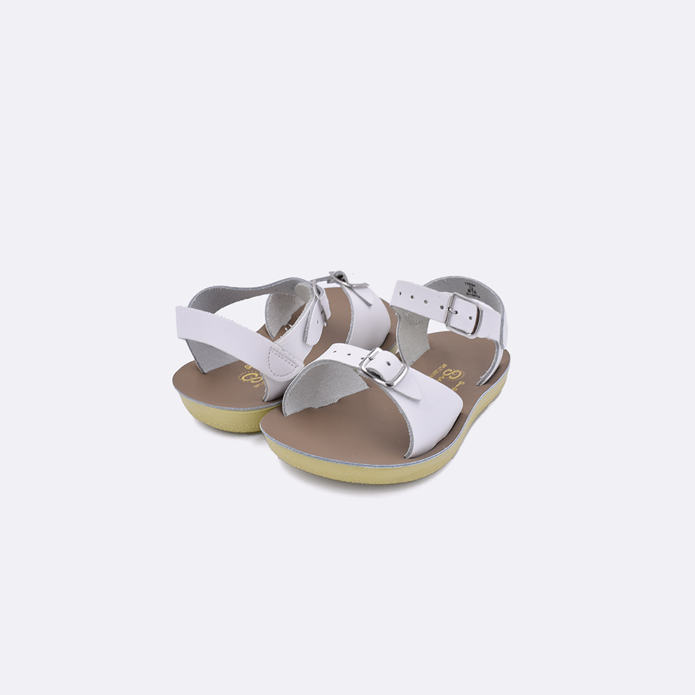 The Sun-San Surfer is a classic two-strap sandal that’s perfect for younger feet. An adjustable toe buckle and ankle strap make them great for both wide and narrow feet. Wear them comfortably all day long — thanks to the lightweight, cushioned urethane sole. Rust-proof brass buckles and scuff-resistant water-friendly genuine leather make them ideal for in-and-out-of-water wear. They clean up so easily and with proper care, they will last for years.