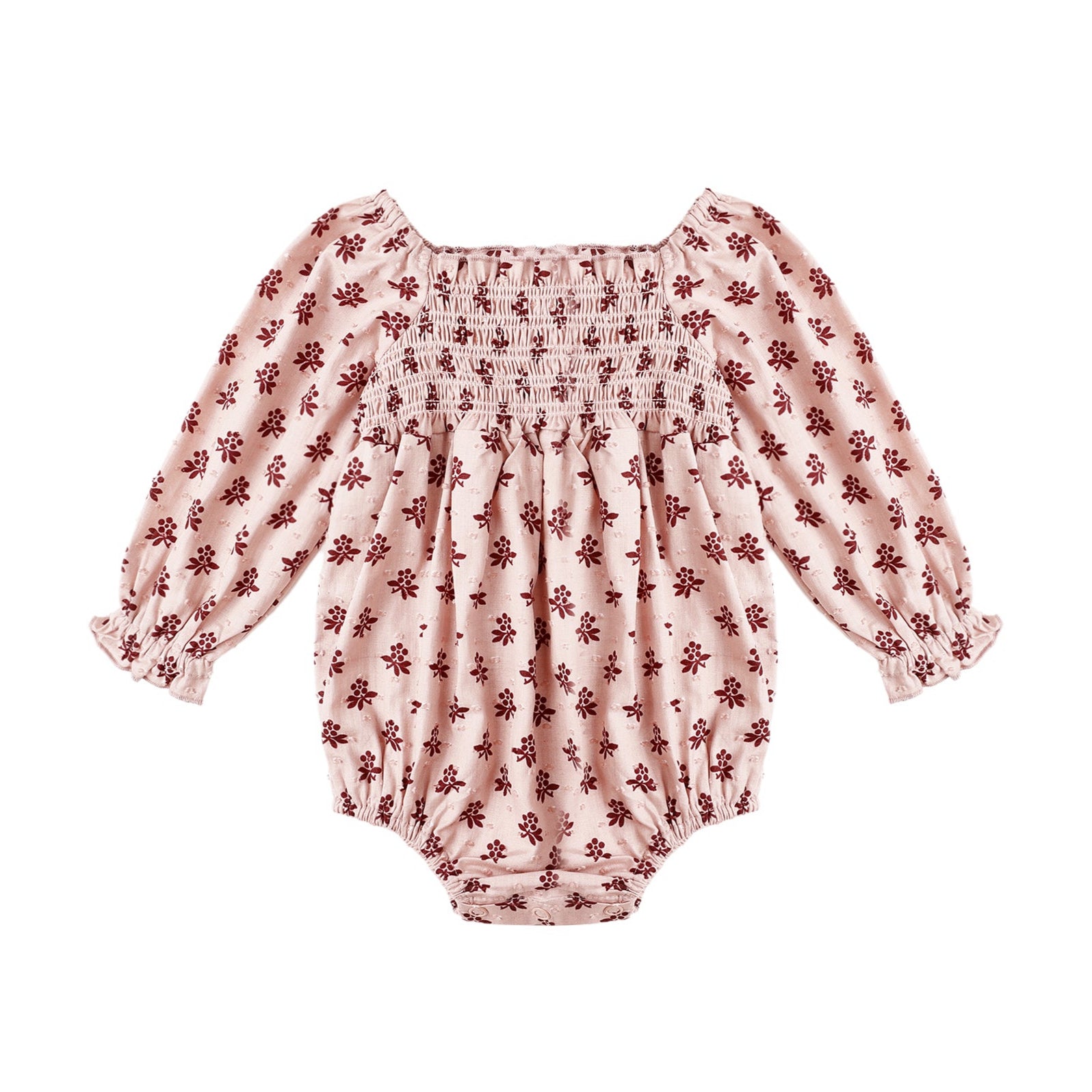 Rylee + Cru's Cora Romper features a delicate square neckline, smocked detailing at the front and back, long puffed sleeves, and convenient bottom snaps for easy changes.