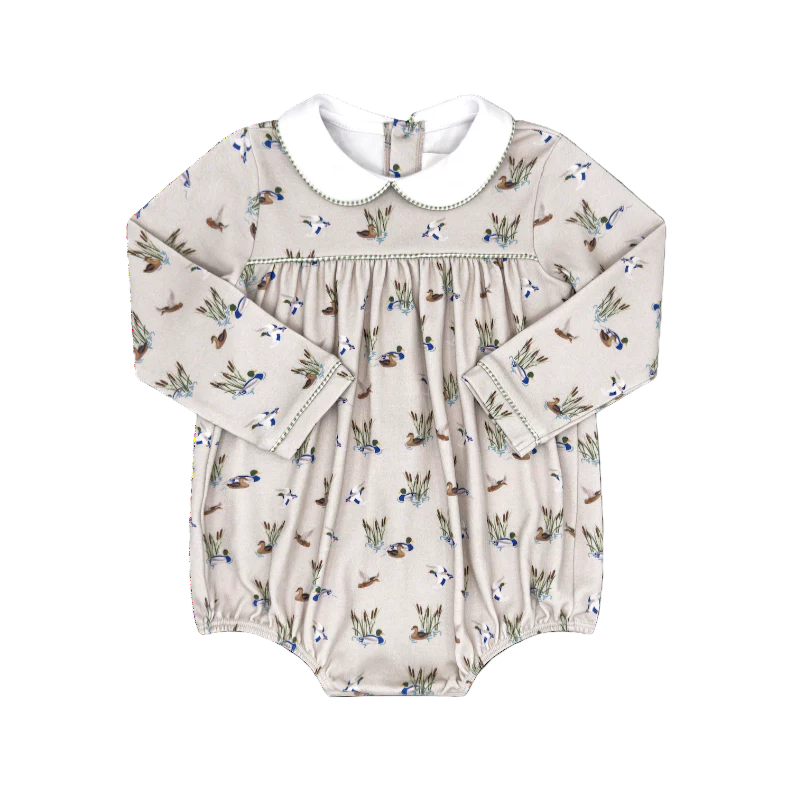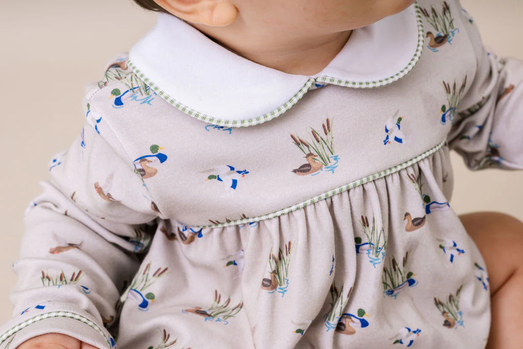 Playful and classic, the Covington Bubble is crafted in Lullaby Set's custom Quacky Adventure knit and finished with green minigingham trim. Long sleeves and heirloom detailing make this bubble perfect for everyday adventures and family outings.