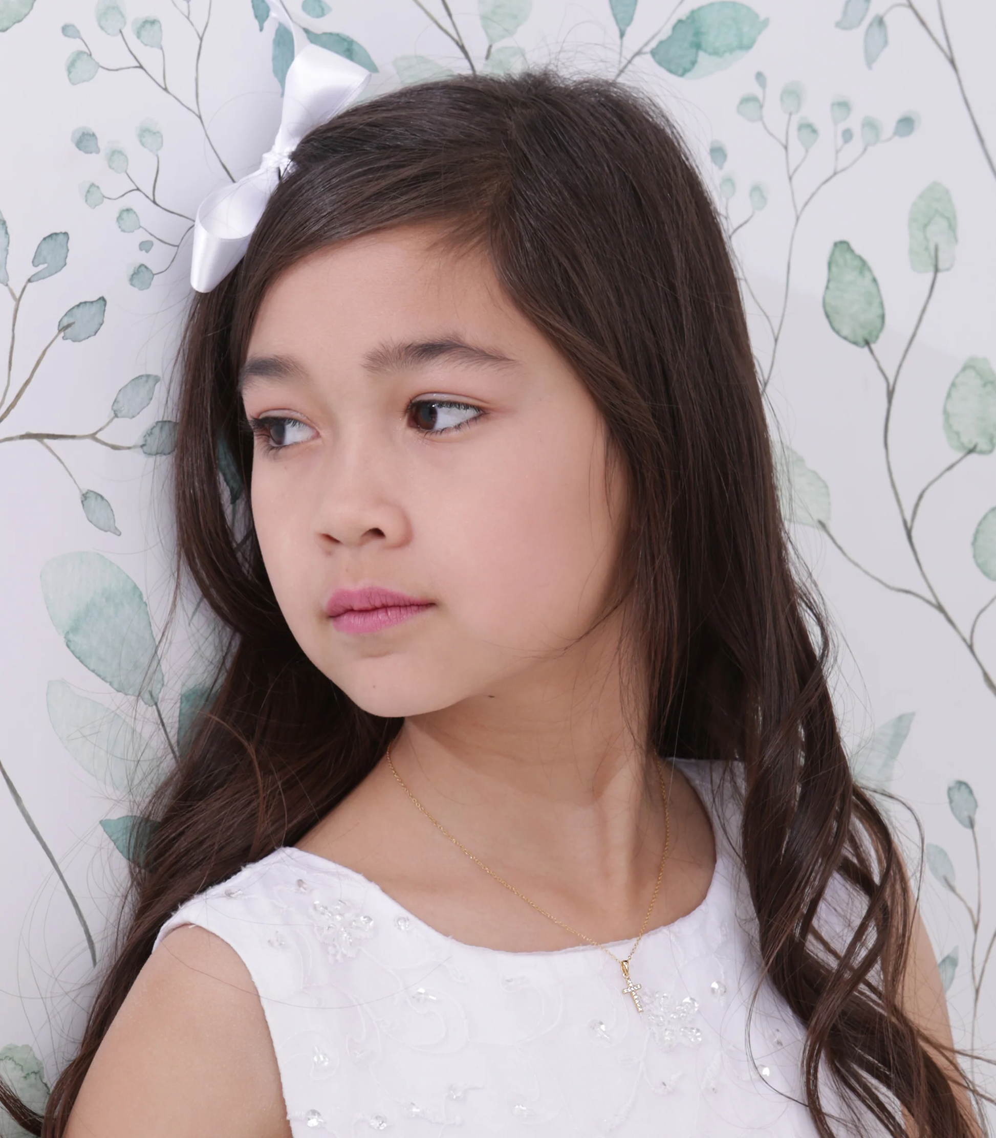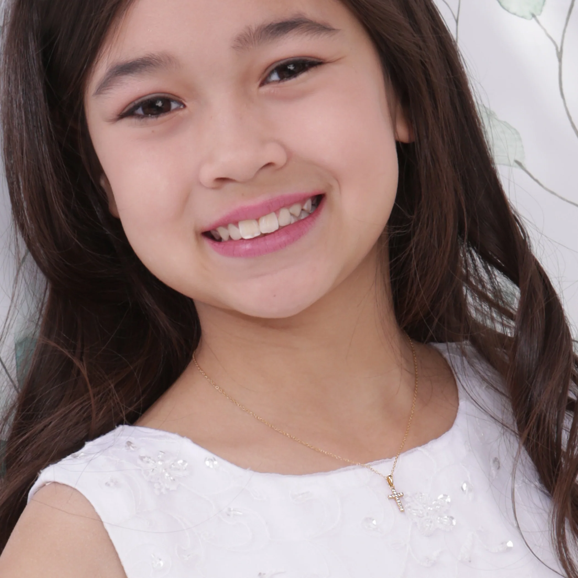 Stunning 14K gold-plated cross necklace accented with sparkling CZs. This high quality necklace is sterling silver with 14K gold plating floating on a 14 inch or 16-18 inch adjustable Italian chain. Perfect gift for those special occasions such as first communion, confirmation, or baptism gift for girls! Coordinating earrings are available.
