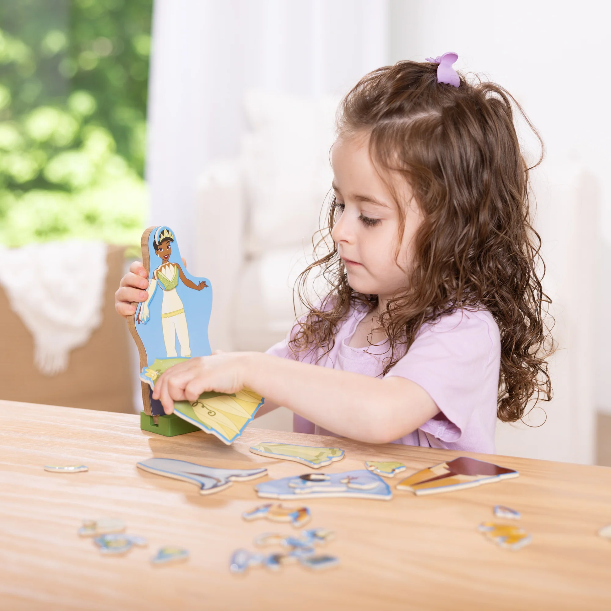 - Dress the Melissa & Doug wooden magnetic figure Disney Princess Tiana in different magnetic outfits to mix and match again and again