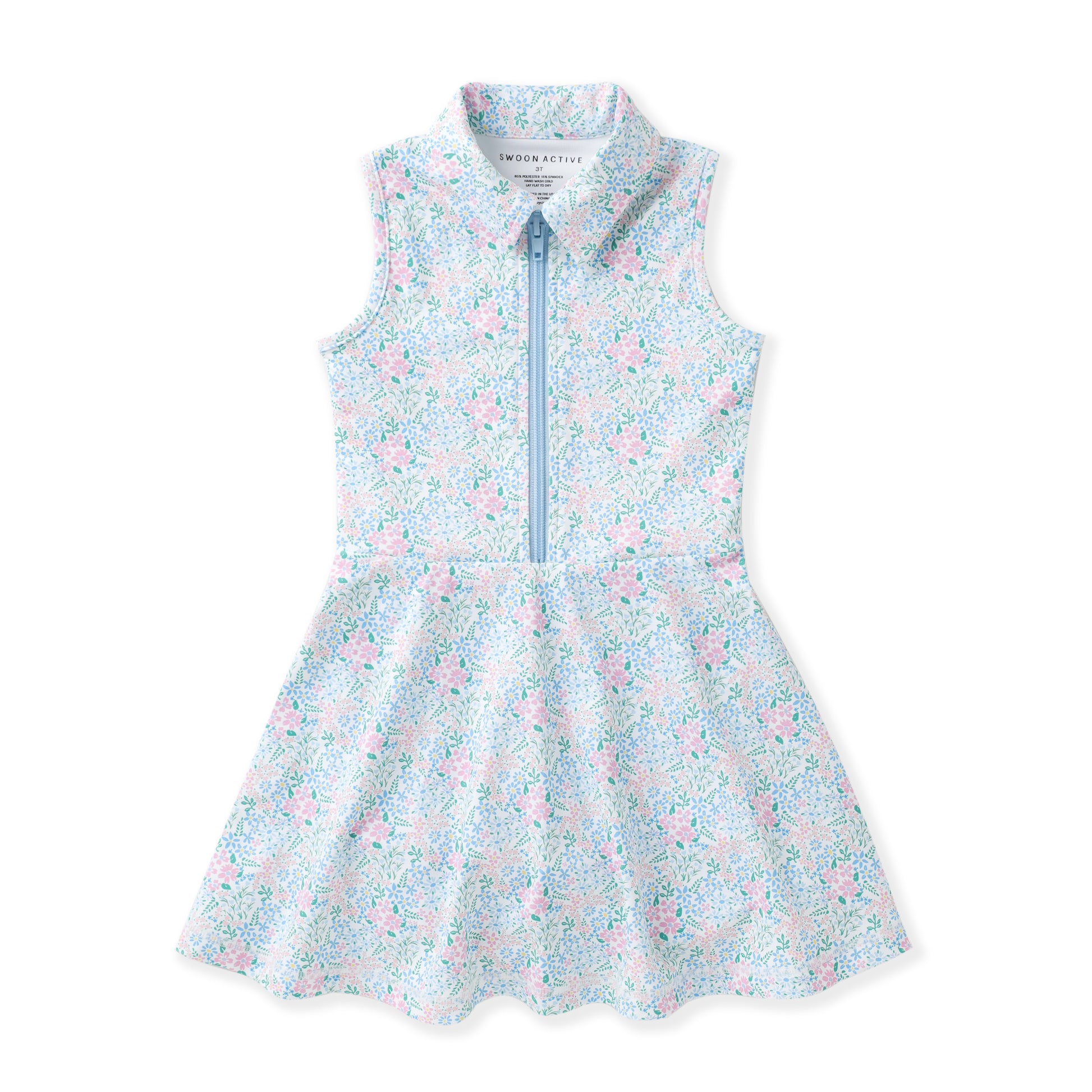 Meet the Ditsy Bloom Dress—where athletic performance meets adorable style! This sleeveless quarter zip features a classic polo collar and a charming blue ditsy floral print that's perfect for active girls who love looking cute while they play. Built for movement with quality construction from Swoon Baby, it's ideal for sports, outdoor adventures, or everyday wear. Comfortable, versatile, and undeniably fun.