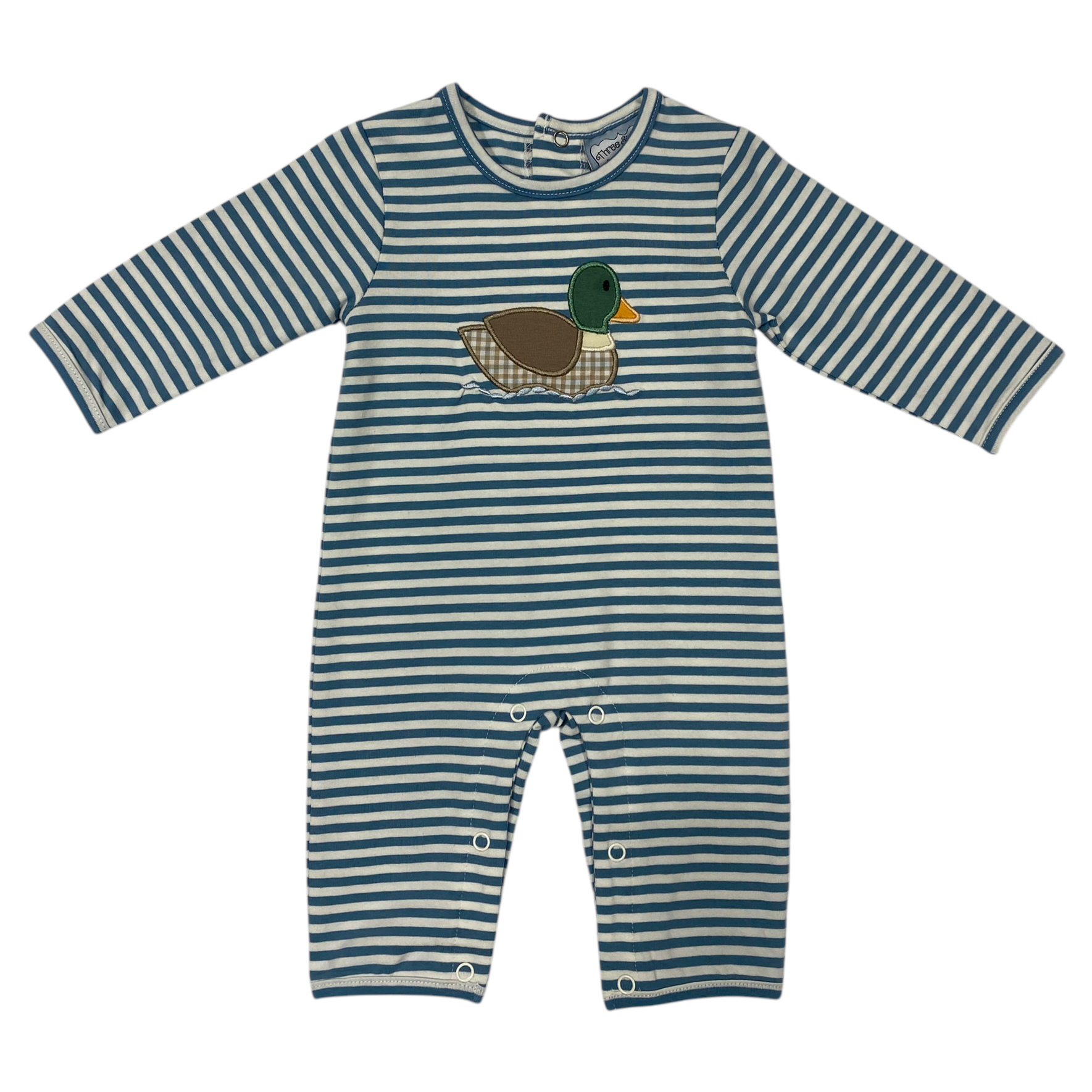 Splash into cuteness with this striped romper from Three Sisters, where blue and white bands meet a waddling touch of whimsy. The chest features a cheerful duck appliqué with green head, chestnut body, and sunny orange beak—ready for pond strolls and puddle-jumping dreams. Snap closures make changes quick, while soft cotton keeps your little one comfy for outdoor adventures or storybook snoozes.