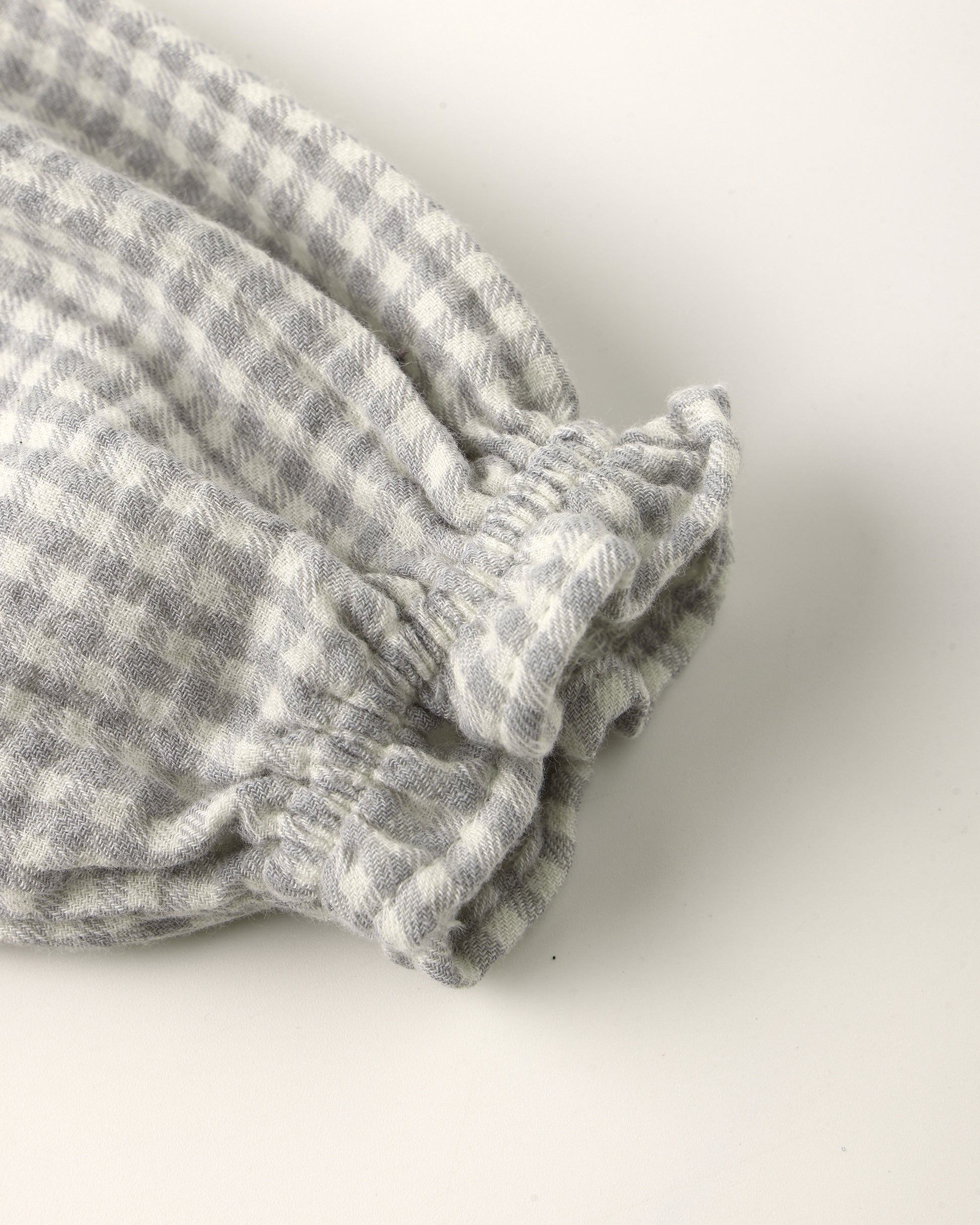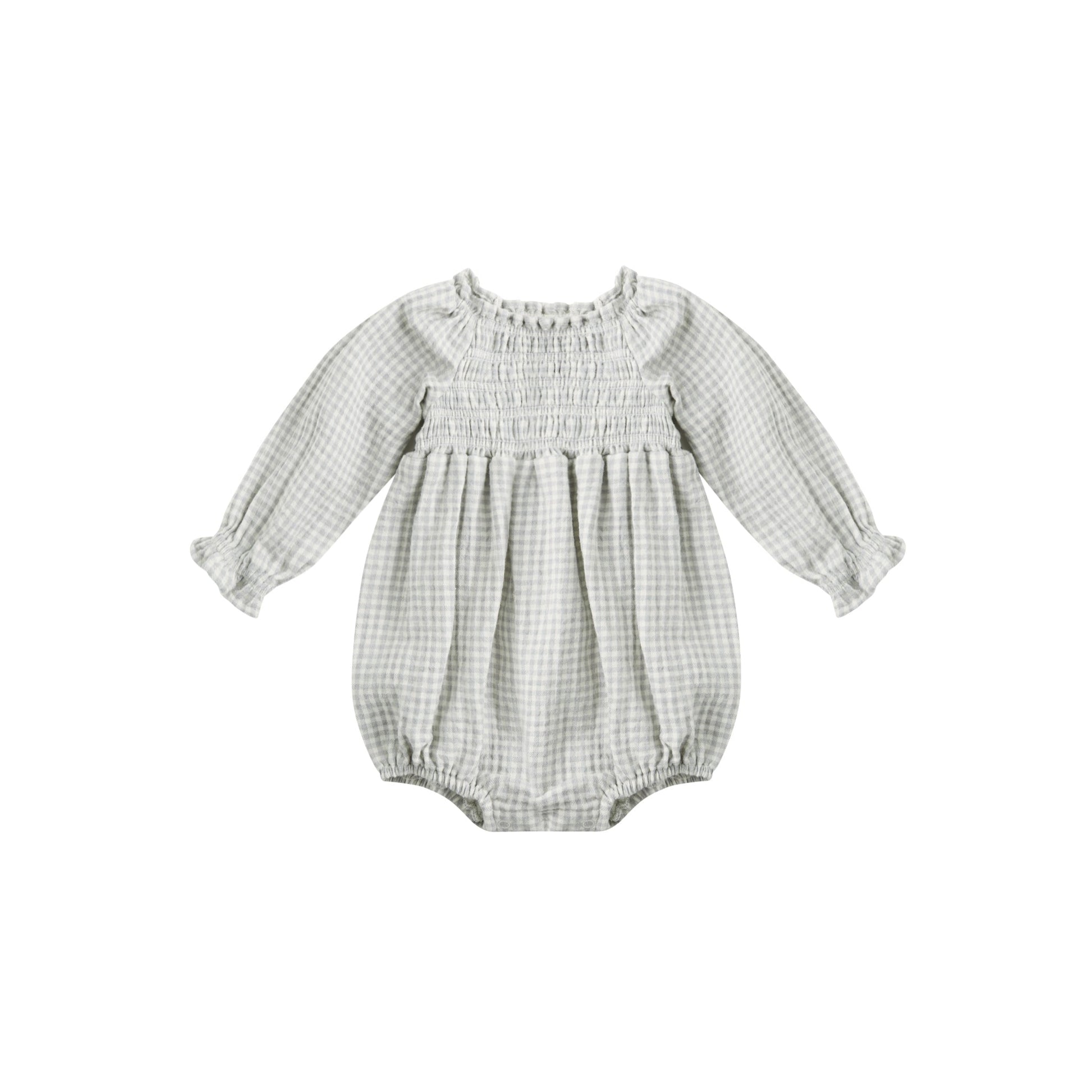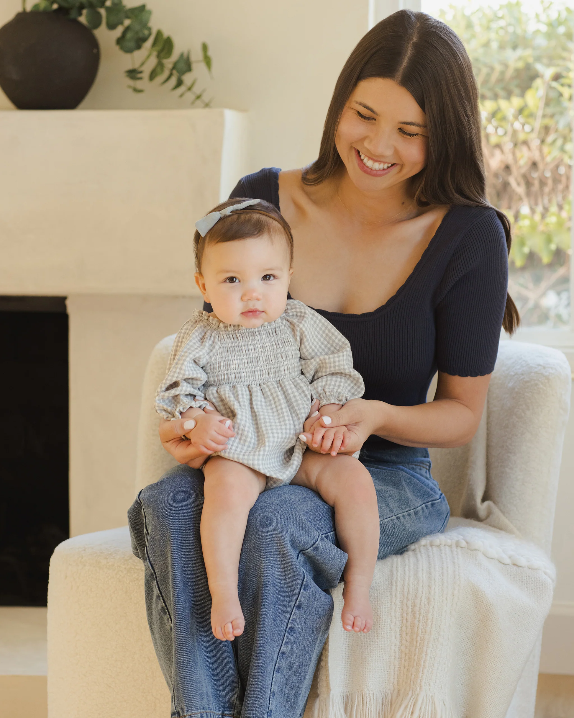 Quincy Mae's Eden Romper features delicate smocking across the chest, gathered ruffle details at the wrists, and a sweet ruffled neckline—an effortlessly charming piece for your little one.