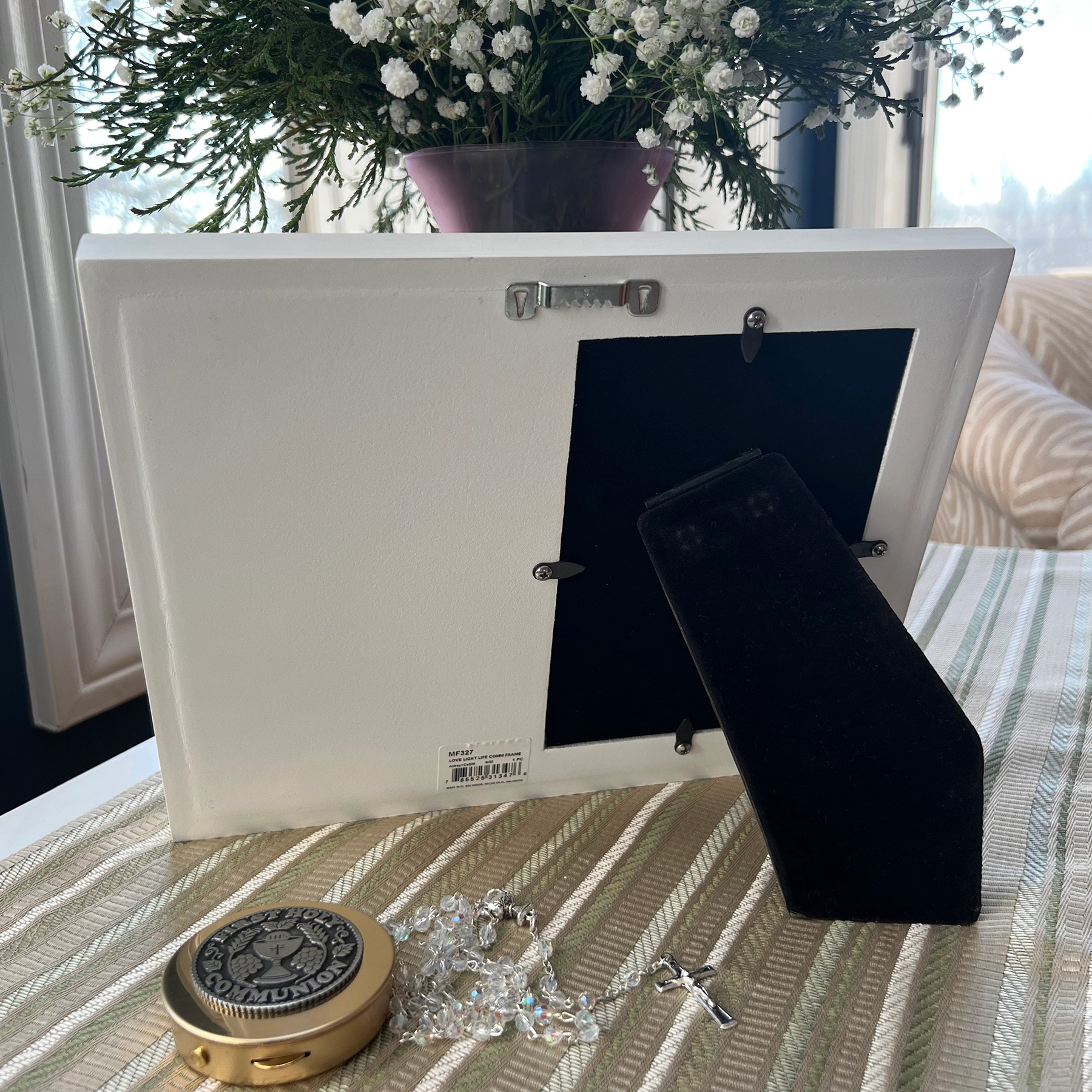 First Communion Photo Frame. This keepsake frame celebrates a child's special day, with a quote that reads, "First Holy Communion - May you be filled with both God's love and the love of your family, today and always" and a Bible verse, Proverbs 3:5-6. Sublimated MDF with lace framing each photo.
