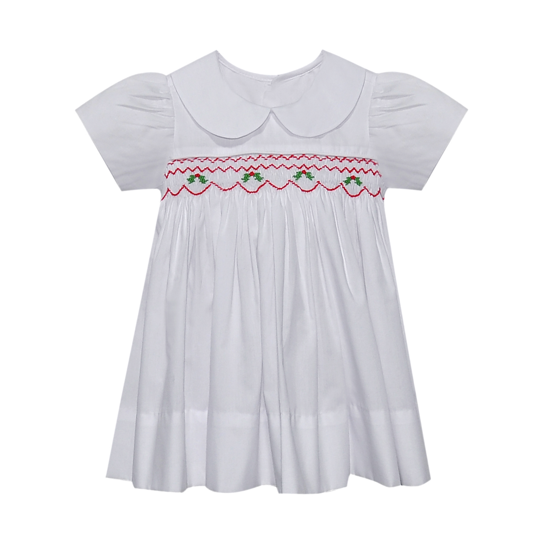 Timeless tradition meets holly jolly detail in this white puff-sleeve dress from Baby Sen. The hand-smocked panel is embroidered with red zigzag stitching and delicate green floral sprigs, echoing a seasonal motif that’s subtle yet full of cheer. The Peter Pan collar and gathered skirt bring vintage polish, making it ideal for fireside photos, festive brunches, or a twirl through grandma’s parlor.