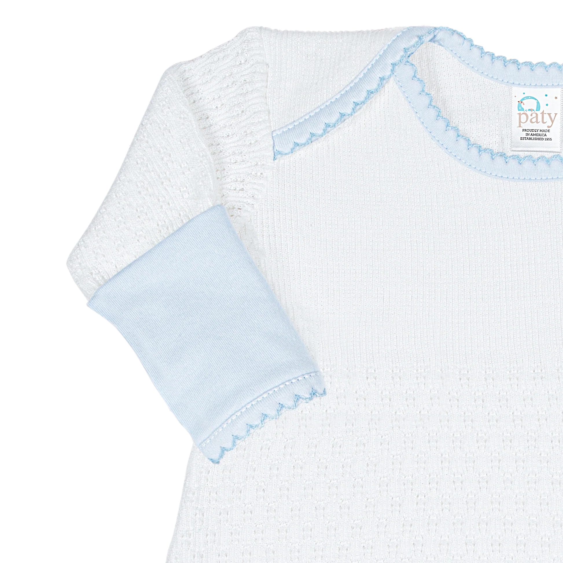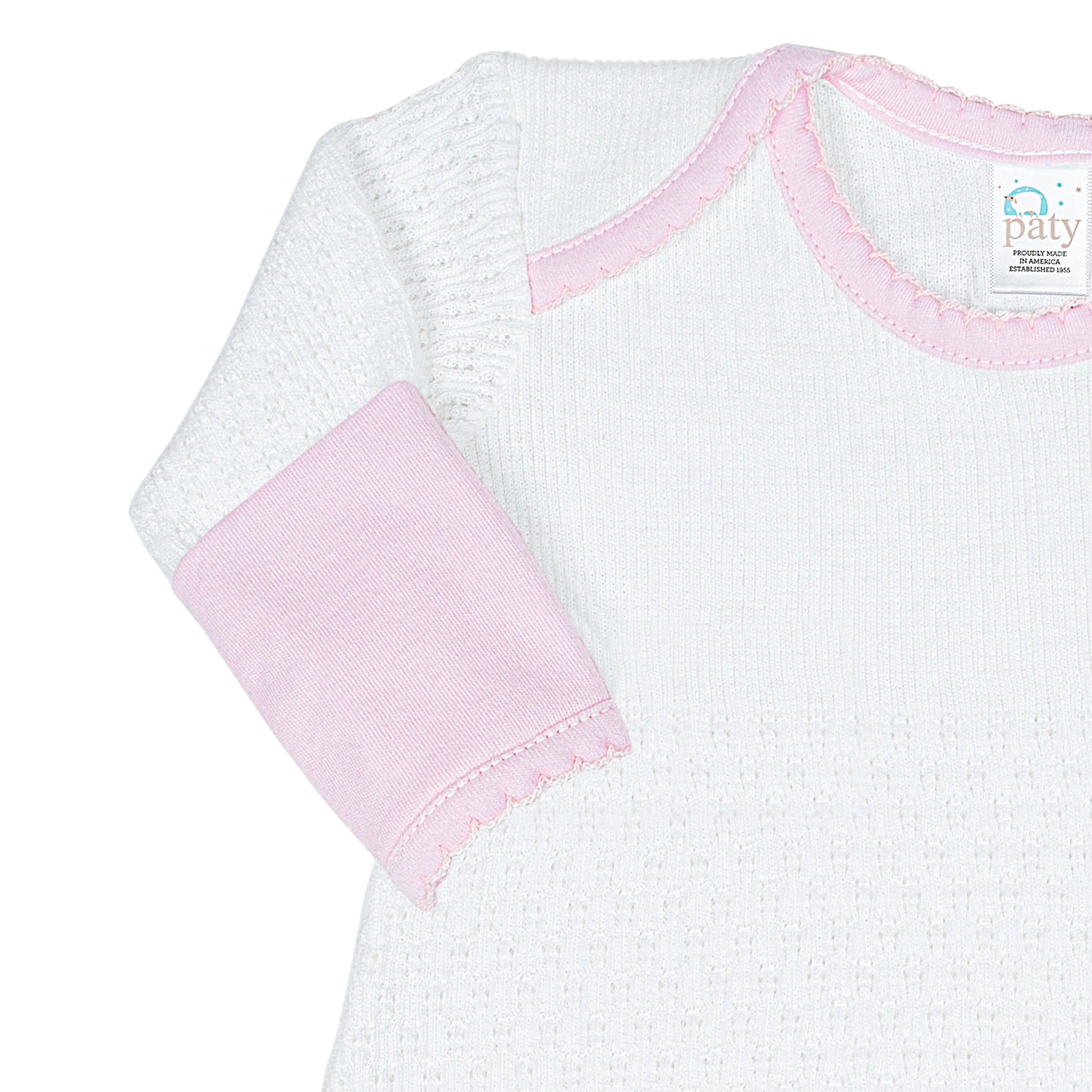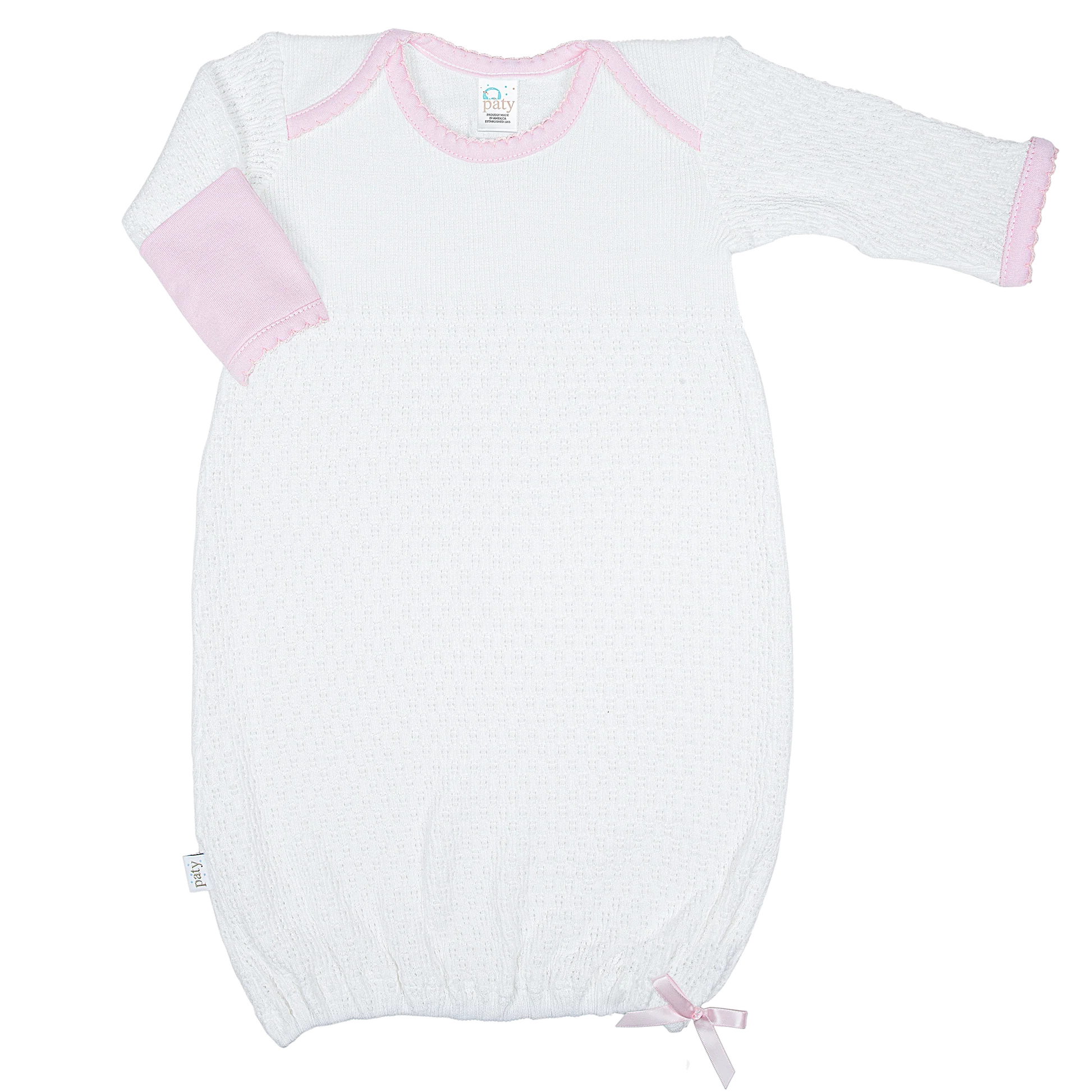 Wrap your little one in cloud-soft comfort with this charming Overlap Gown from PATY. Crafted from premium Pima cotton, this gown features a gentle overlap design that makes diaper changes a breeze while keeping baby cozy and secure. The silky Pima trim adds a touch of elegance to this everyday essential. Perfect for newborns and infants who deserve the gentlest touch, this gown is a nursery staple that parents adore.