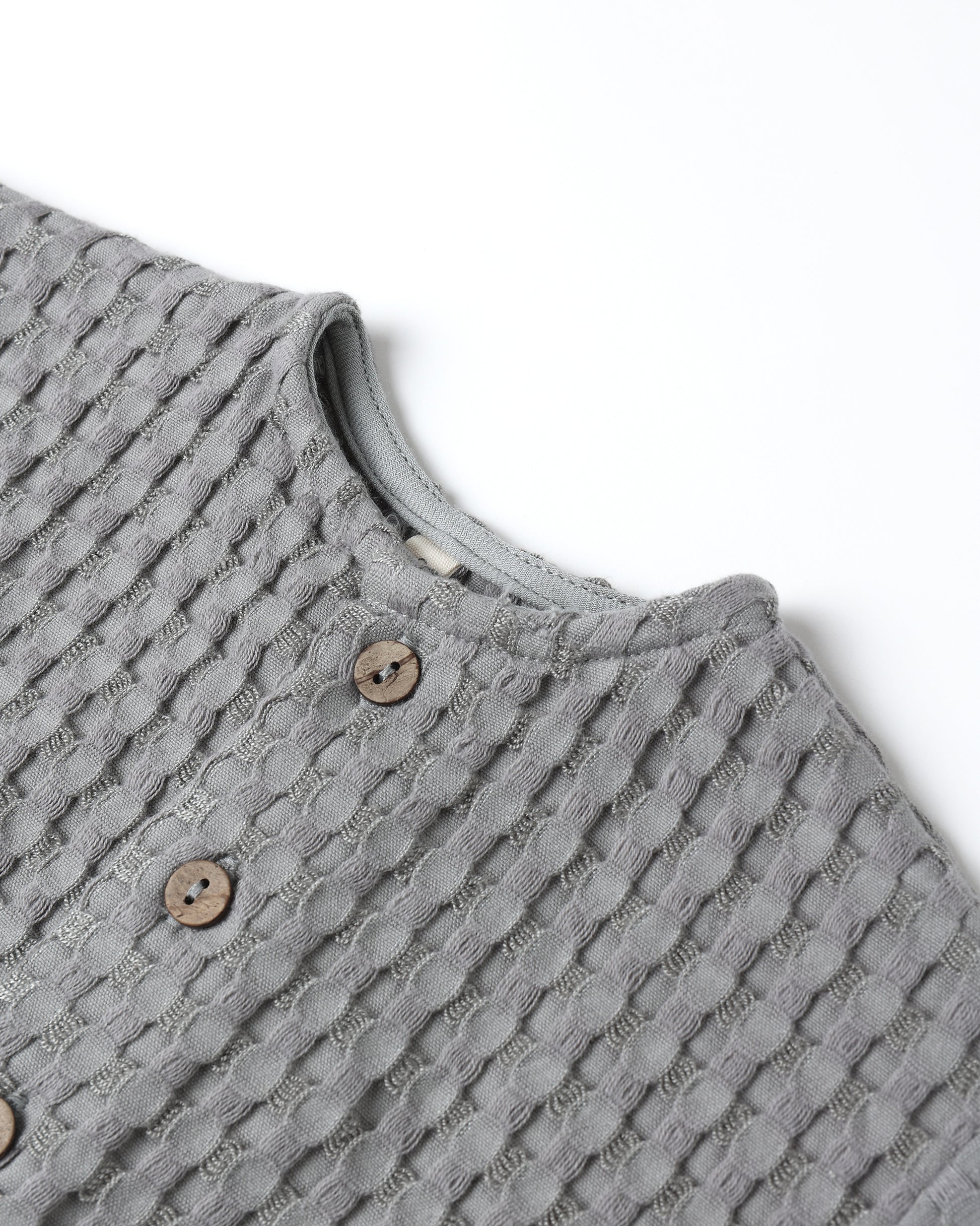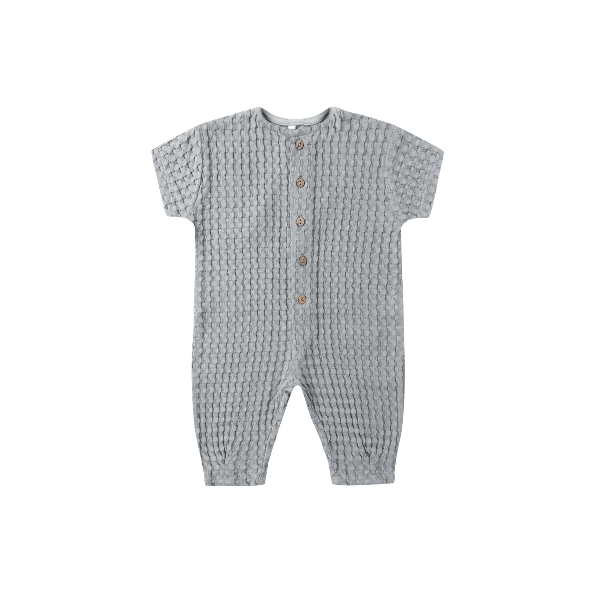 Made from their chunky waffle knit, Quincy Mae's Hayes Jumpsuit features short sleeves, full-length tapered legs, and coconut buttons down the front—perfect for in-between weather.