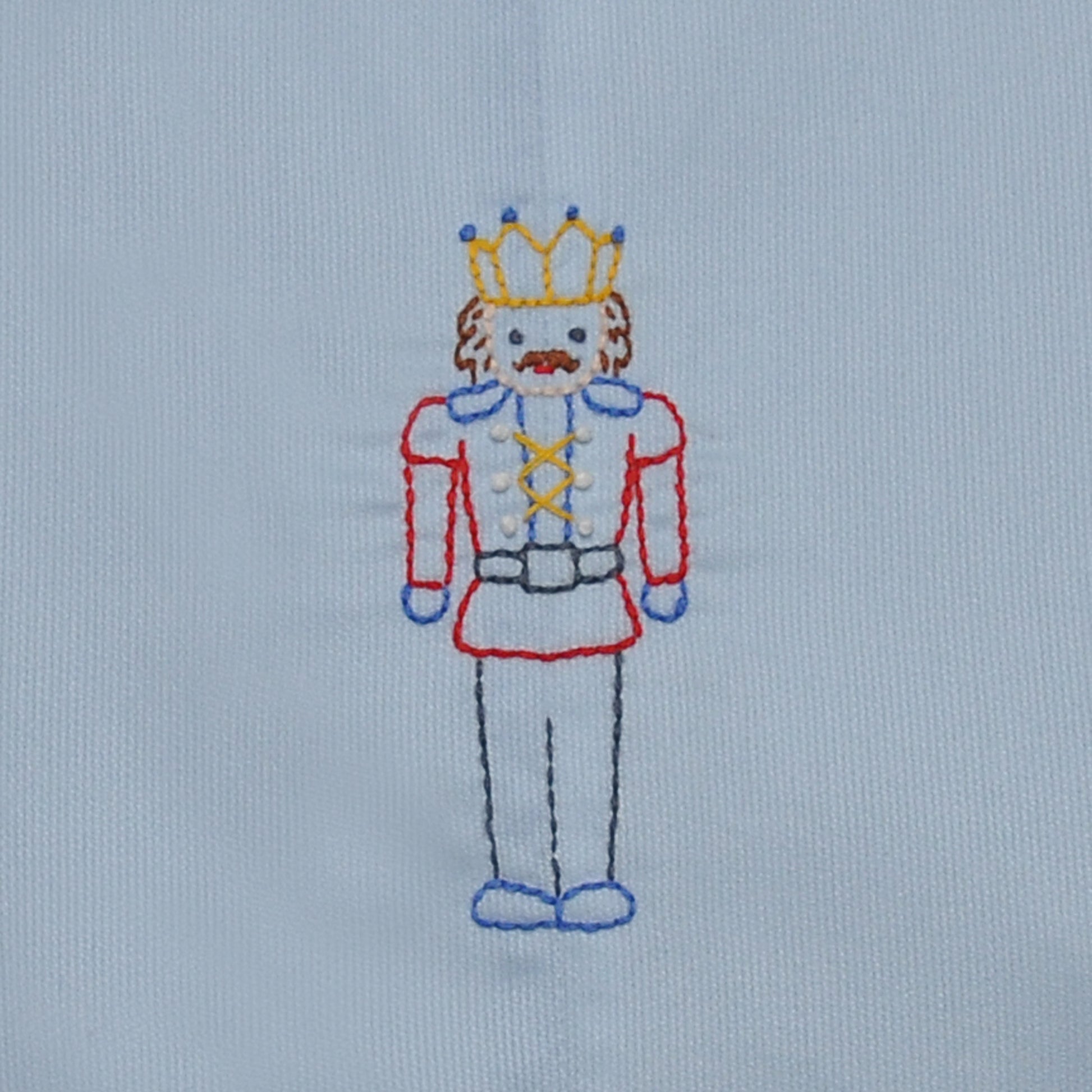 - Embroidered nutcracker in classic red and blue holiday tones