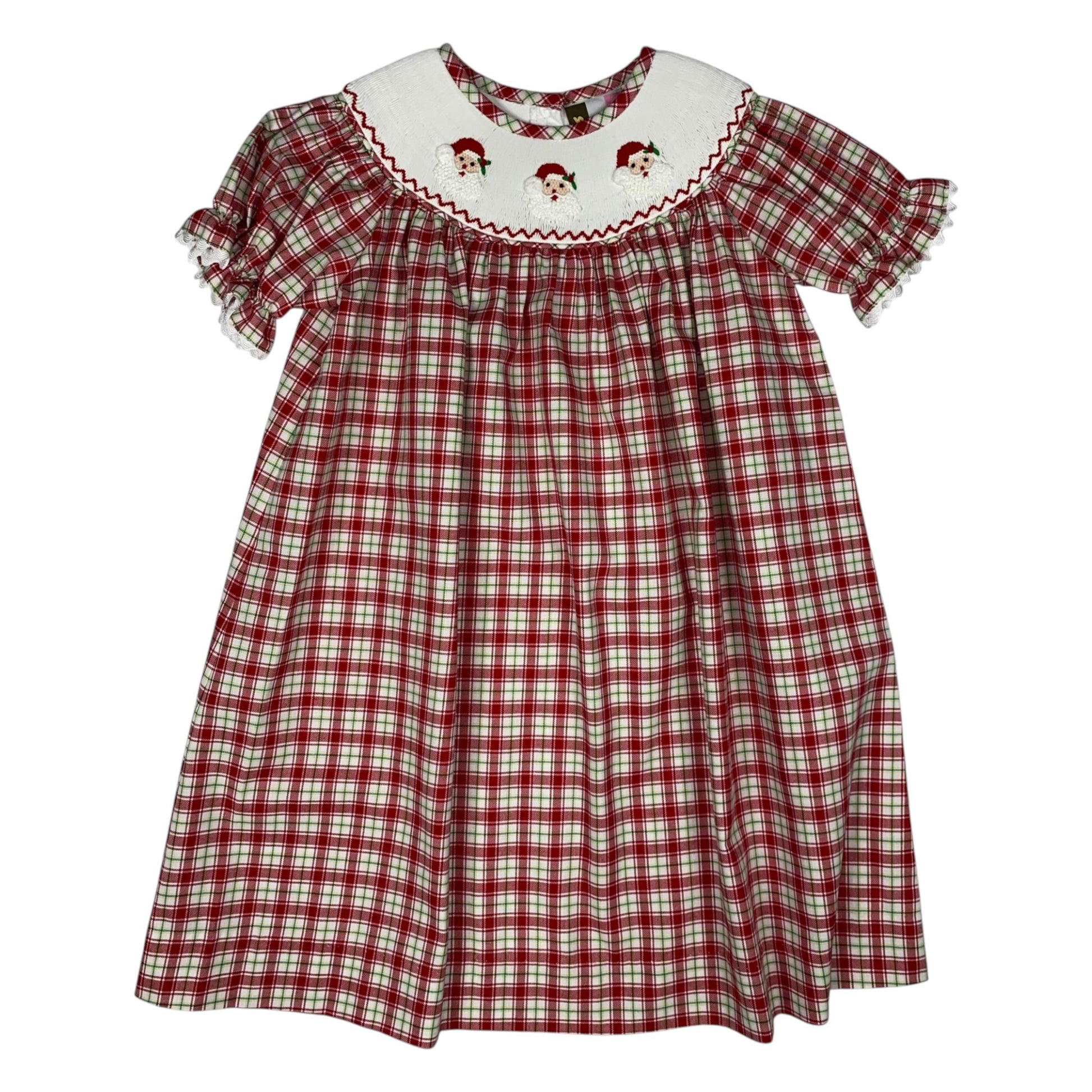Holiday-ready and full of cheerful charm, this Banana Split bishop dress is a festive favorite for the season. Designed in a vibrant red and green plaid, the classic silhouette features a smocked white neckline adorned with embroidered Santa Claus faces and zigzag red stitching for an extra dose of holiday whimsy. Short puff sleeves with delicate ruffled trim add a playful touch, while the lightweight fabric ensures comfort for all-day celebrations. Perfect for Christmas parties, family gatherings, or holiday portraits, this dress is a standout style made to spread seasonal joy.