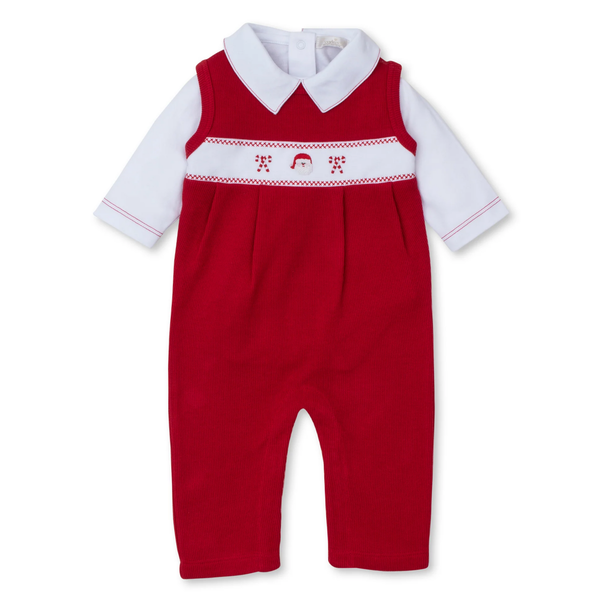 The softest, coziest overall set from Kissy Kissy's CLB Holiday Medley 25 Collection is crafted from the finest Pima cotton, with delicate hand embroidered candy canes and Santa and timeless design for baby.