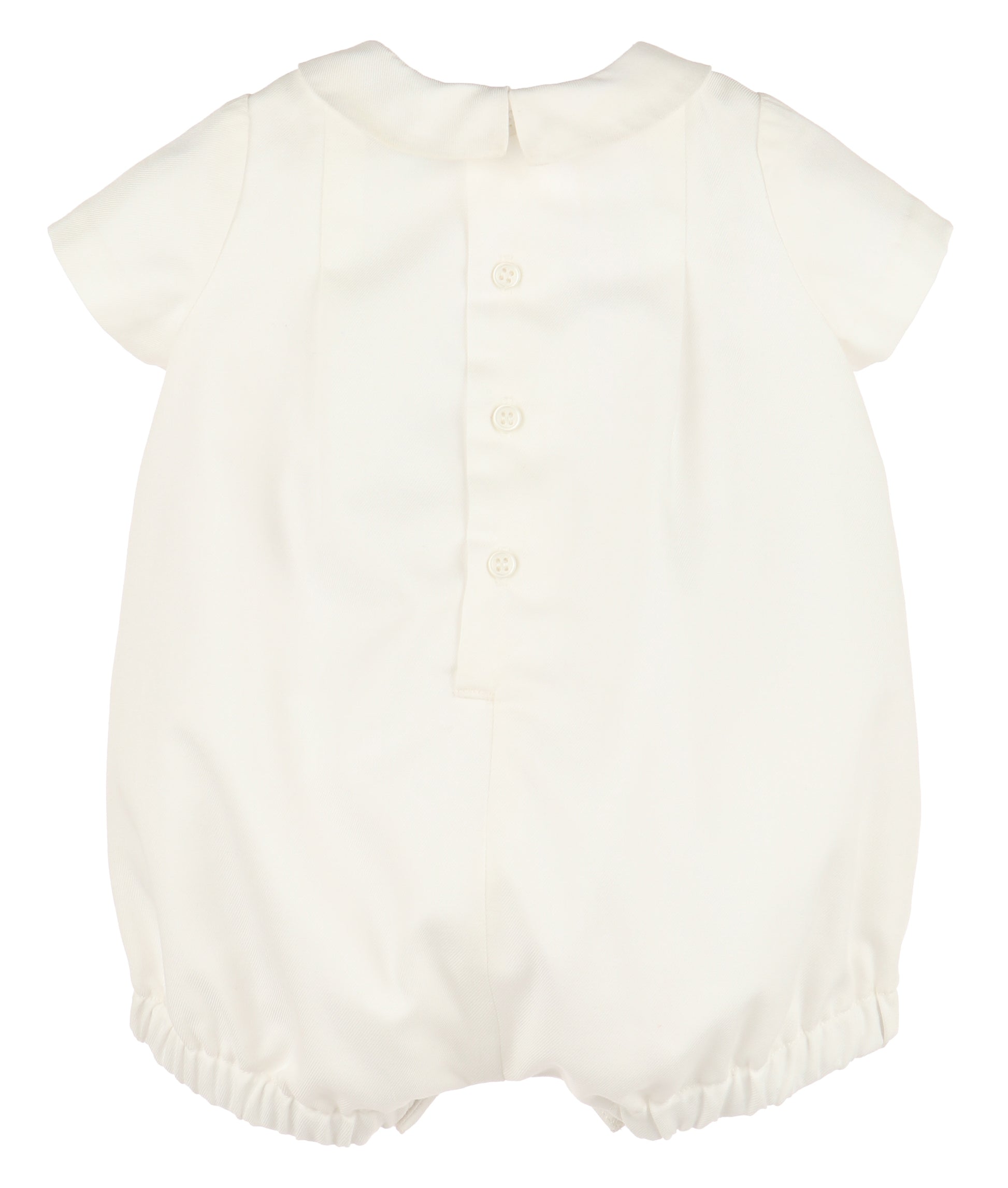 A darling dose of autumn elegance, this baby boy bubble from Luli & Me is all about refined charm. Featuring a soft cream base with gentle pleating and intricate smocking, it’s topped with a classic Peter Pan collar that whispers tradition. Whether he’s headed to a family gathering or stealing the show at Sunday service, this timeless piece promises picture-perfect sweetness with every step.