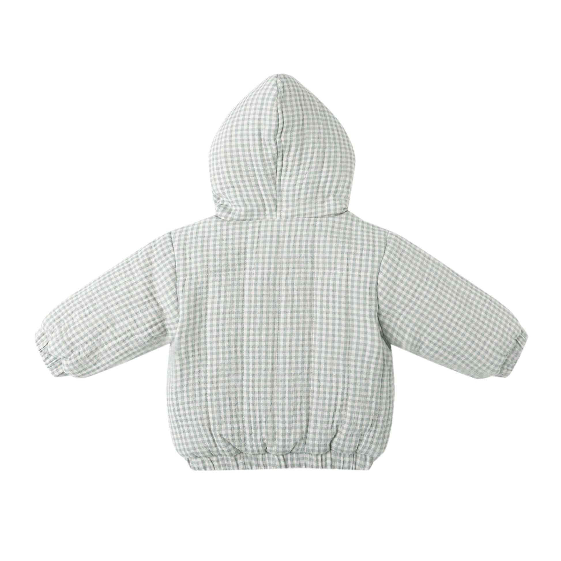 Quincy Mae's Hooded Woven Jacket features front patch pockets, fabric covered snaps, elastic at the sleeves and waist for a snug fit, and a cozy hood for the cooler days ahead.
