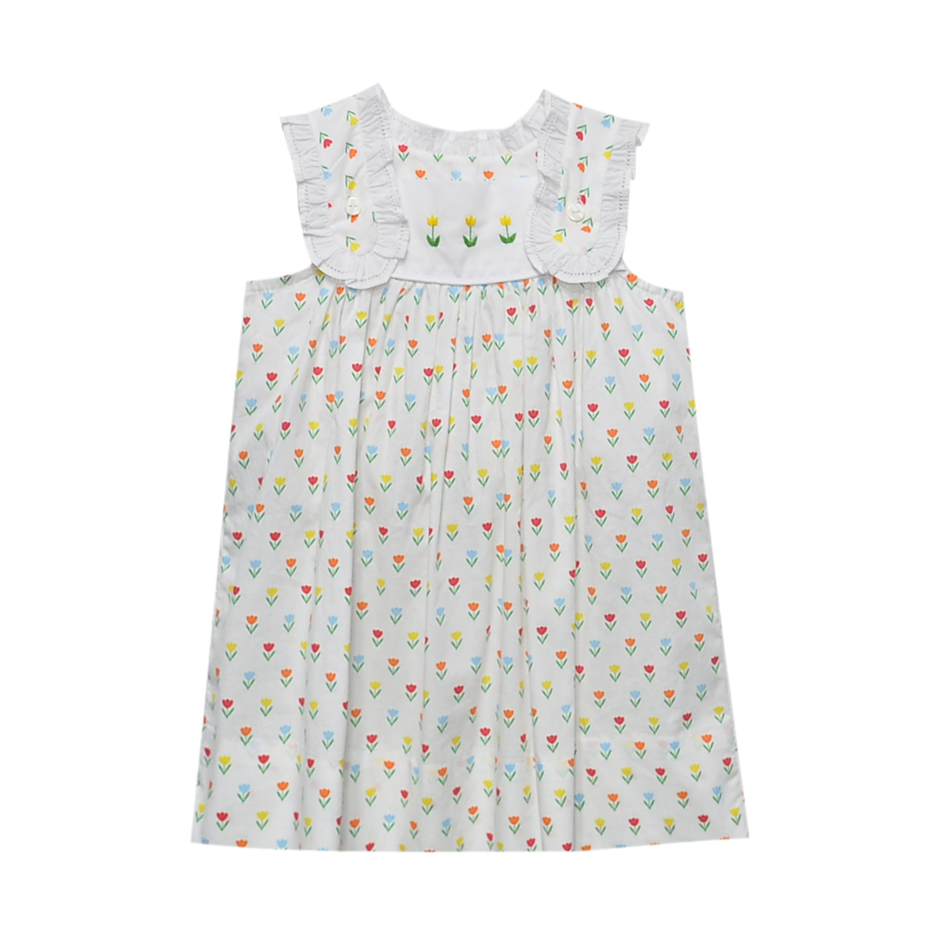 Twirl into springtime style with this charming Iris Dress from Baby Sen, featuring a cheerful tulip print that celebrates the season. Three delicate embroidered tulips grace the neckline, adding a sweet handcrafted touch. The clever tab sleeves button for easy dressing and undressing—perfect for active little ones. Coordinate with the matching bubble for your baby's little sister and create an adorable twinning moment!