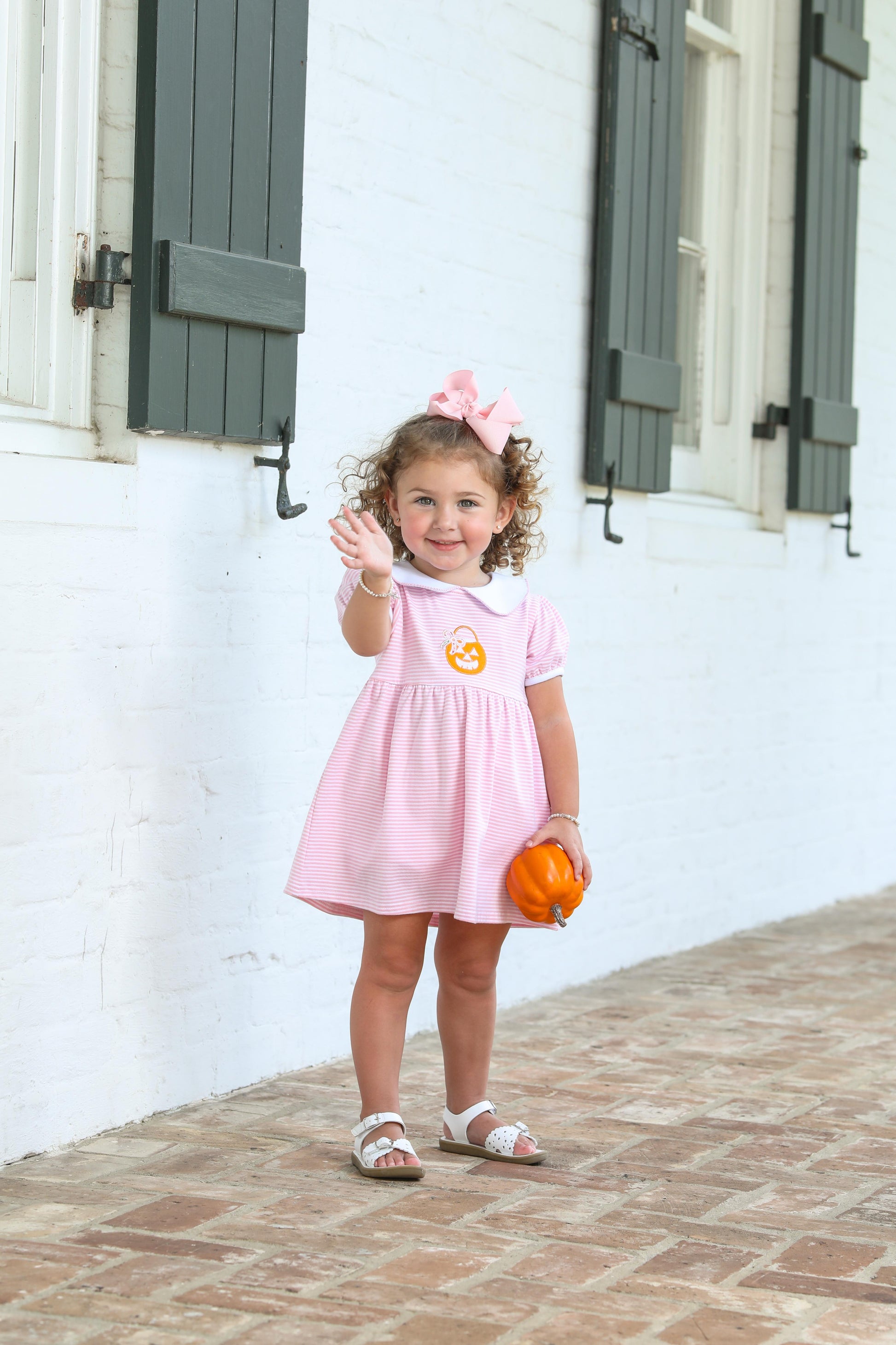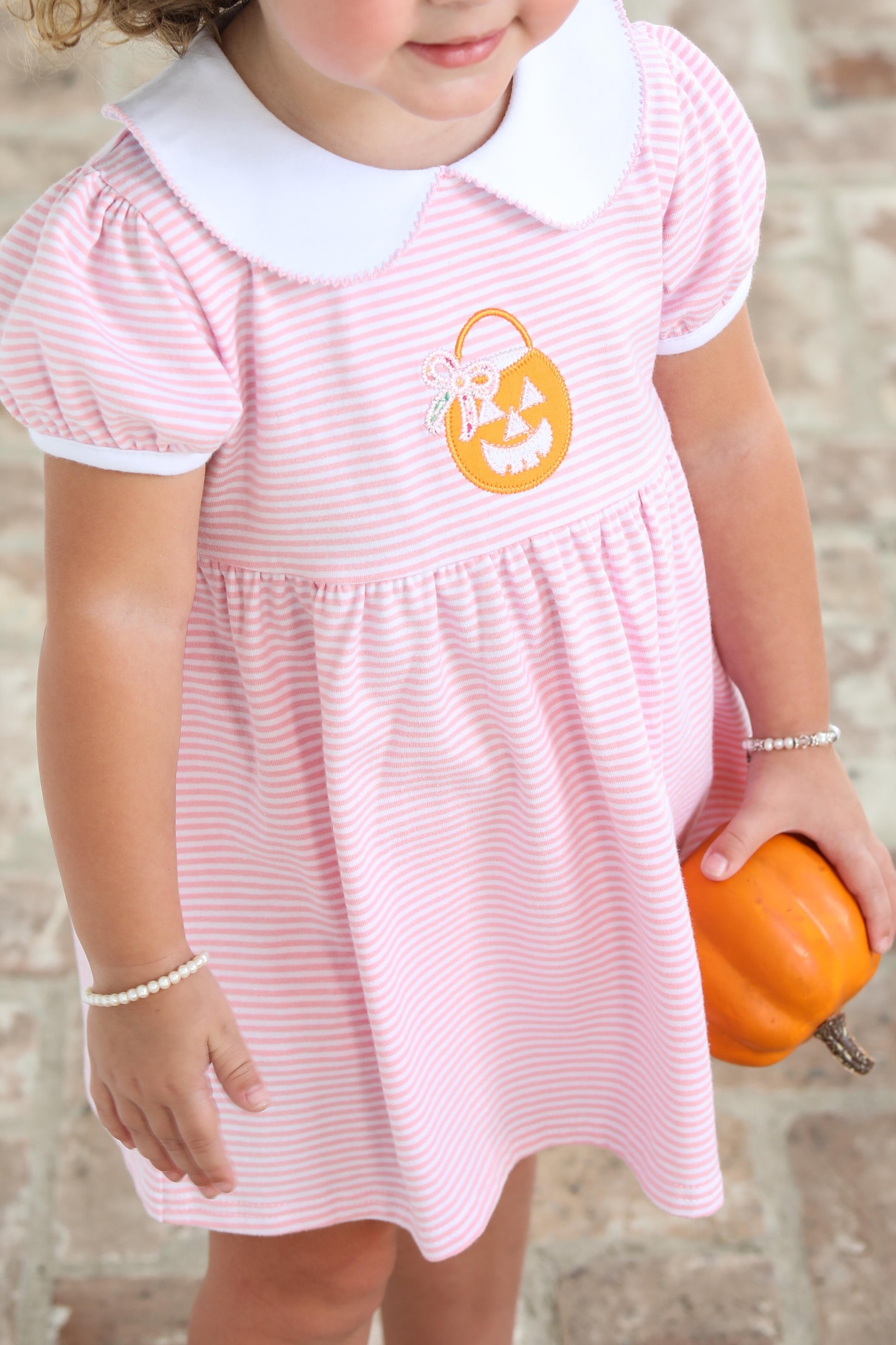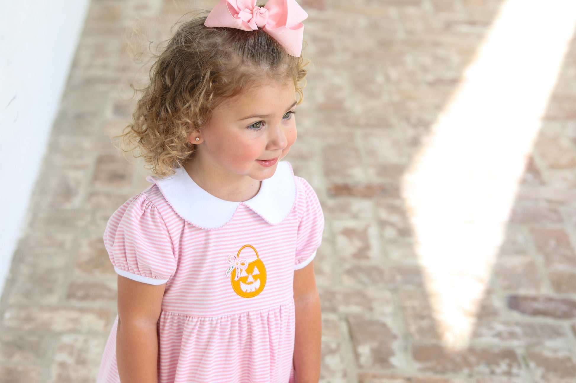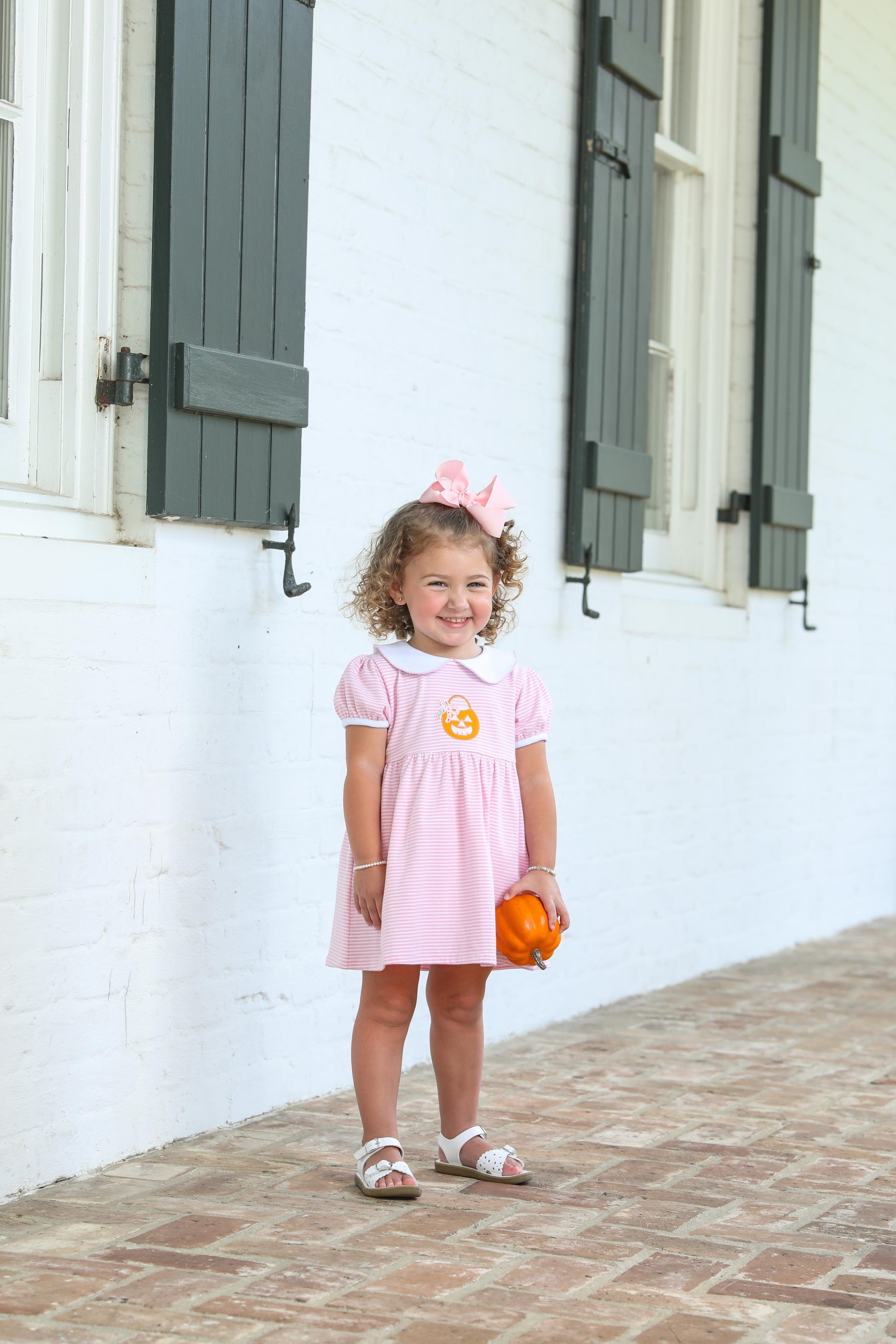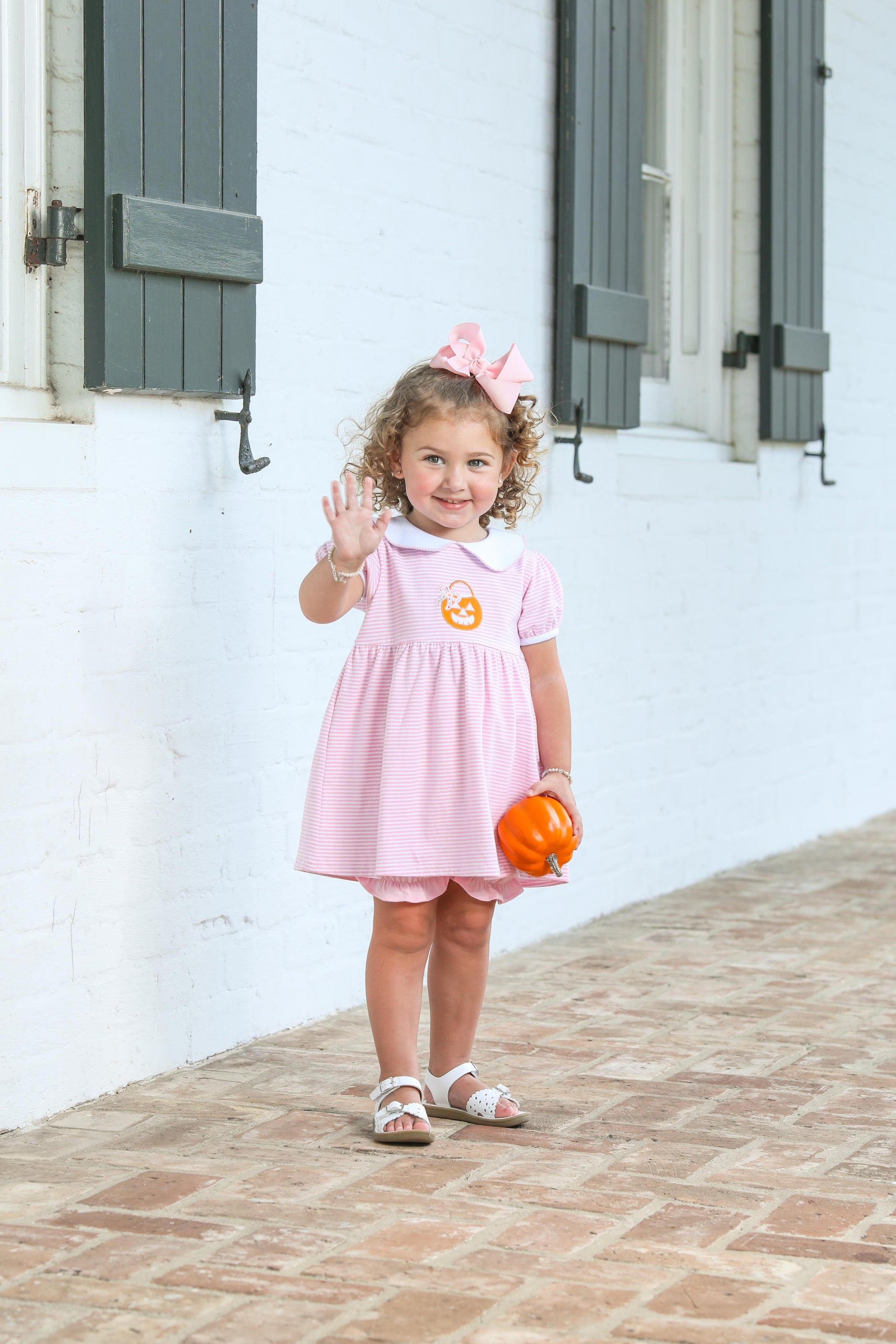 The Jack O' Lantern Bloomer Set from Trotter Street Kids is a festive favorite for fall’s tiniest trick-or-treaters. Made from soft pink and white striped knit, this short sleeve top features a crisp white Peter Pan collar and a cheerful jack-o'-lantern appliqué accented with a bow. Paired with matching pink bloomers trimmed in gentle ruffles, it’s a sweet and spooky set perfect for pumpkin patch visits and Halloween fun.
